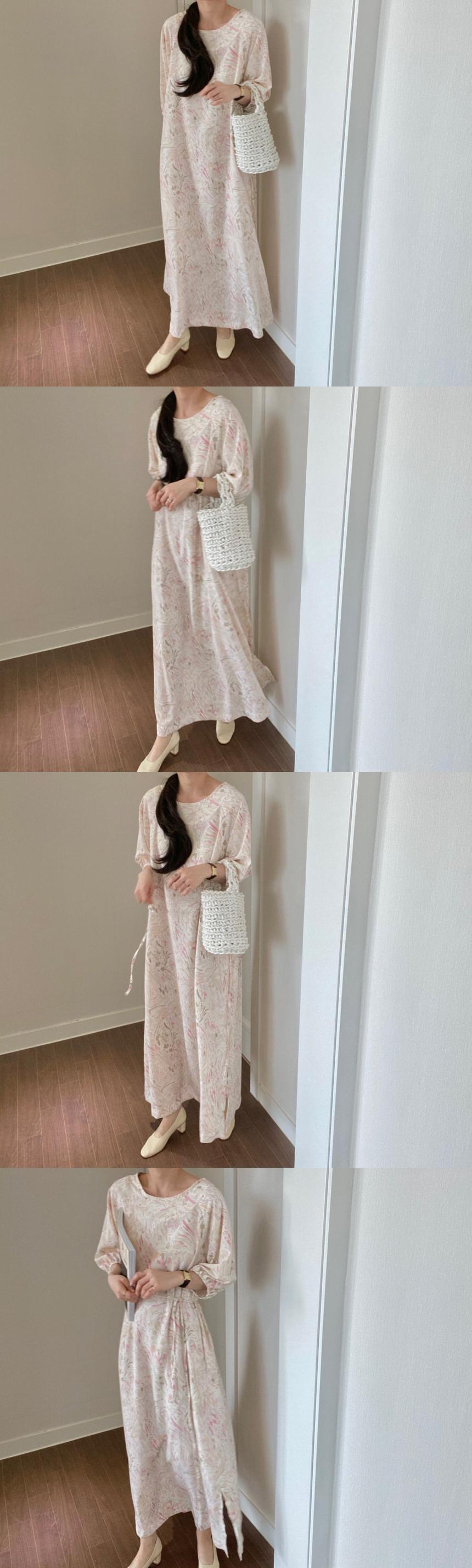 シックなフレンチエレガントな油絵抽象印刷ラウンドネックスリミングウエストシフォンドレスロングスカート女性 韓国婦人98573533277