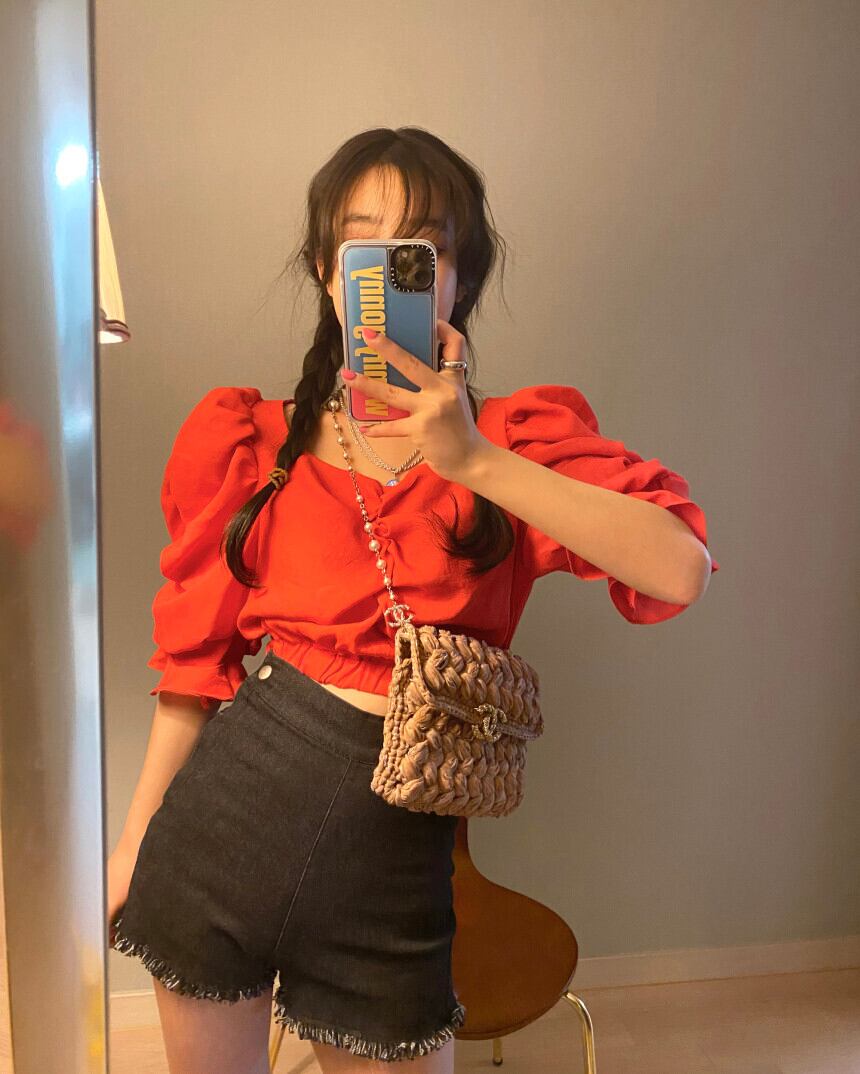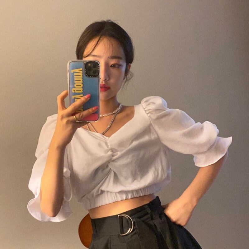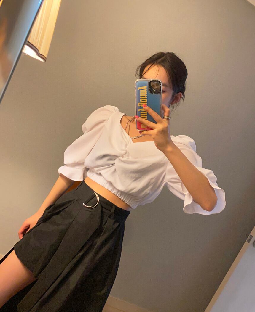 シックなウエスタンスタイルのワイルドな薄いスクエアカラーのリーク鎖骨プリーツ慎重なマシンスリミングパフスリーブショートシャツ女性 韓国婦人15569810215