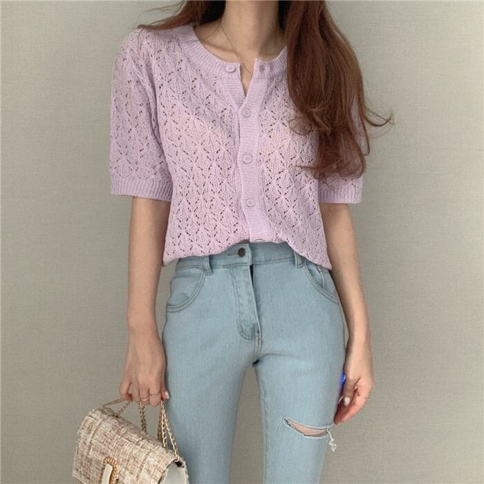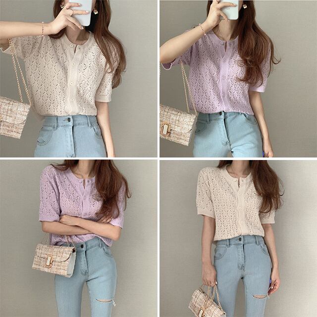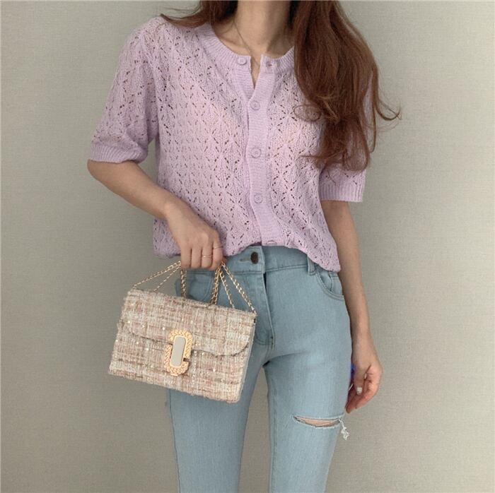 insゴーストホースサマーワイルドホローシングルブレストシンアイスシルクニット半袖Tシャツトップ女性 韓国婦人67116607311