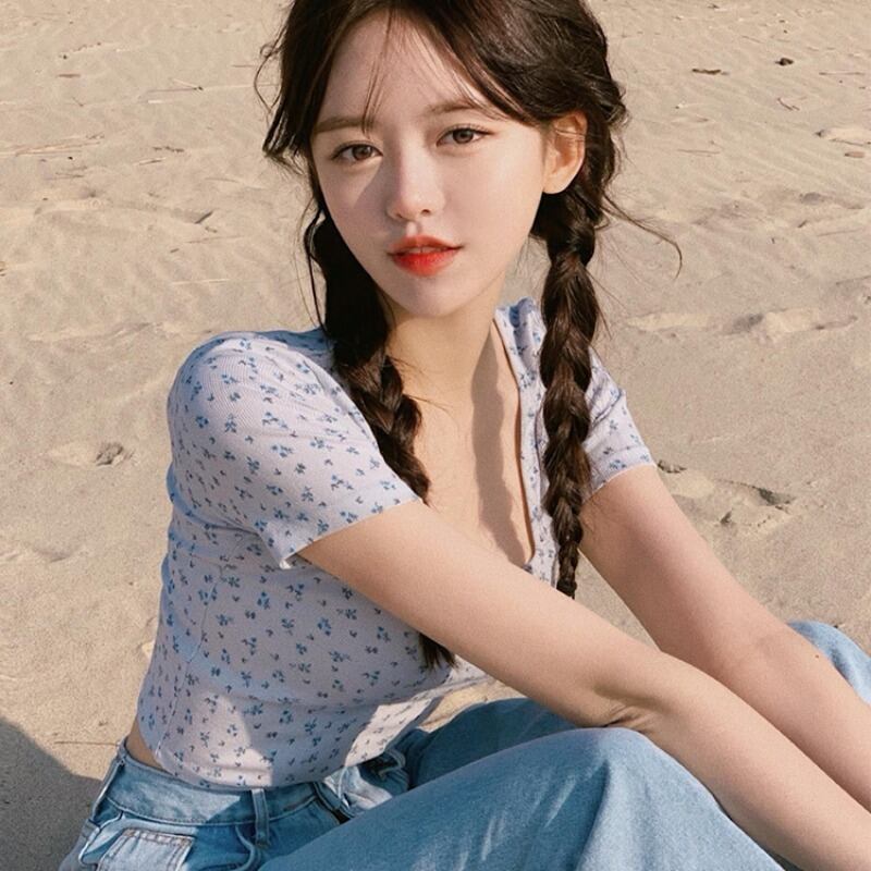 シックな年齢を減らす遊び心のあるフルスクリーン小さな花の四角い首スリム痩身短いへそボトミングシャツTシャツ女性 韓国婦人29474833912