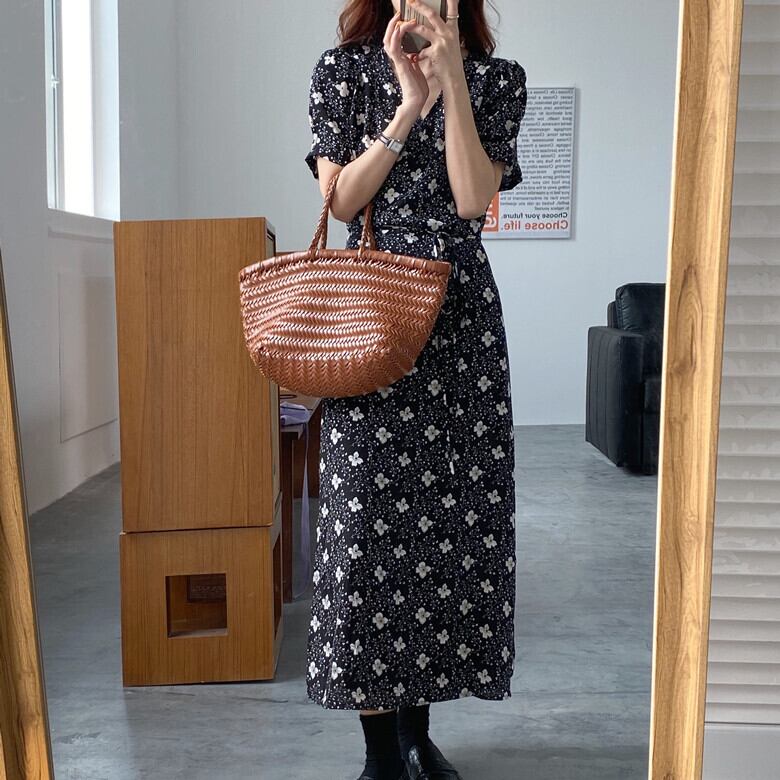 シックなロマンティックシーズンバイオレットスモールフローラルは細いVネックネクタイウエストワンピースドレスロングスカート女性 韓国婦人50203057095