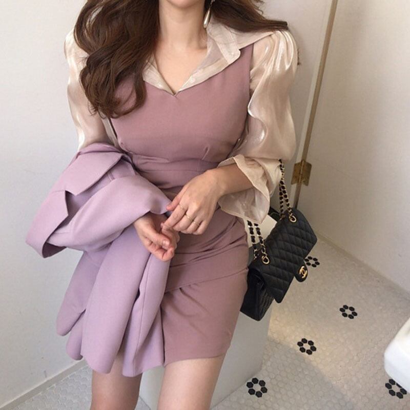 シックなウエスタンスタイルの小さなセクシーな光沢のトランペットスリーブシャツ+薄い不規則なプリーツドレススカート 韓国婦人23711806945