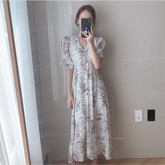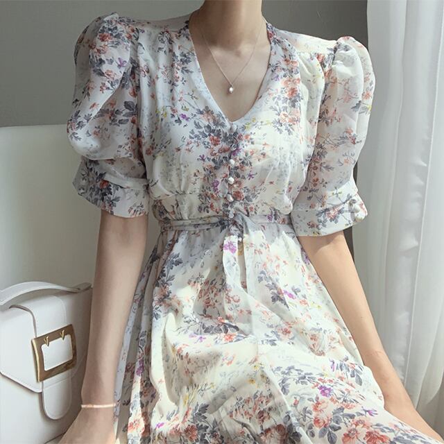サウスシックレトロ優しい小さな花柄Vネックスリミングネクタイウエストロングパフスリーブシフォンドレス女性 韓国婦人73153846977