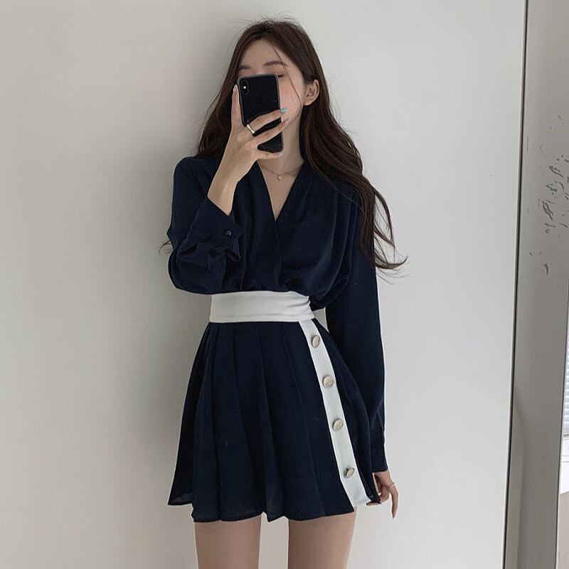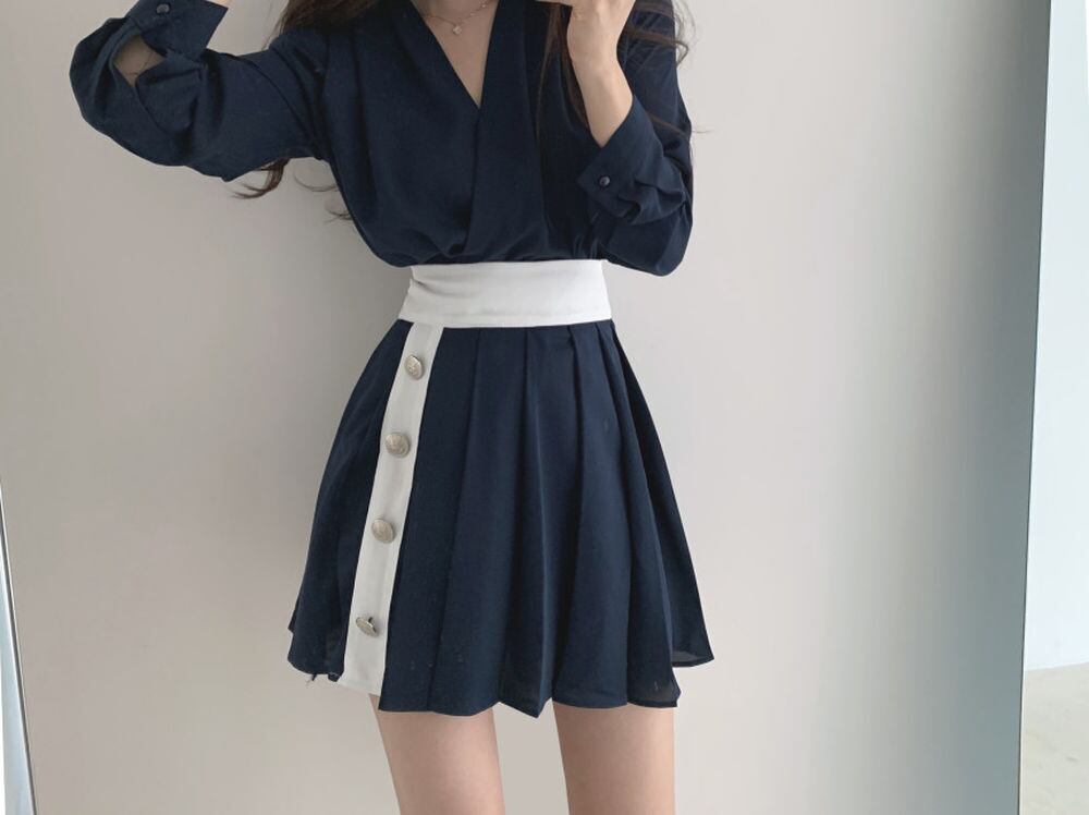 シックな夏のフレンチレトロVネックルーズ長袖シャツ+コントラストハイウエストボタンプリーツスカートメス 韓国婦人43357488327