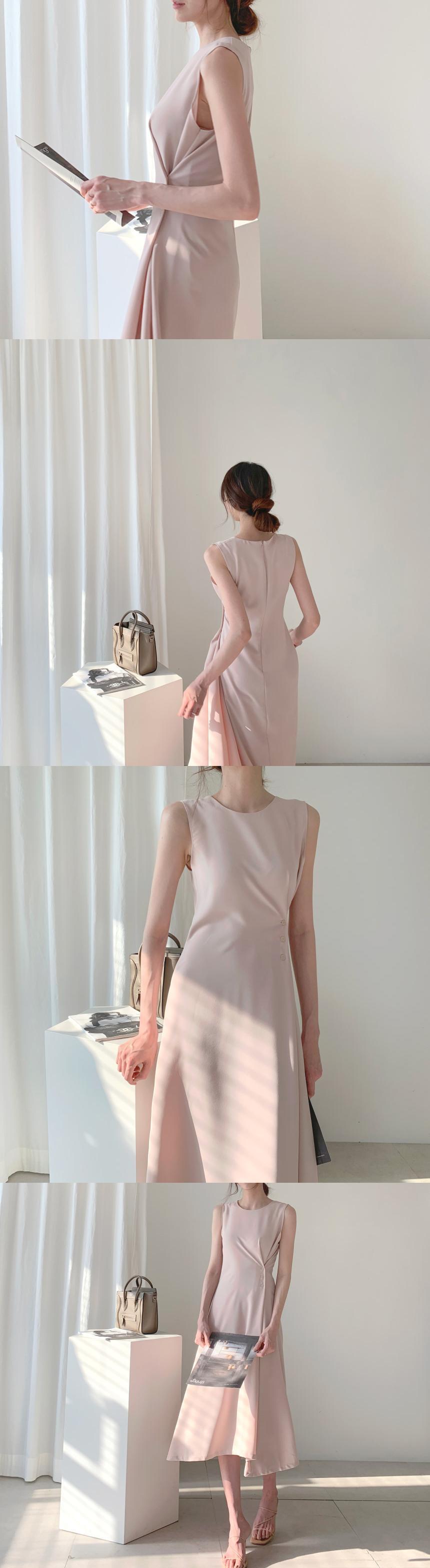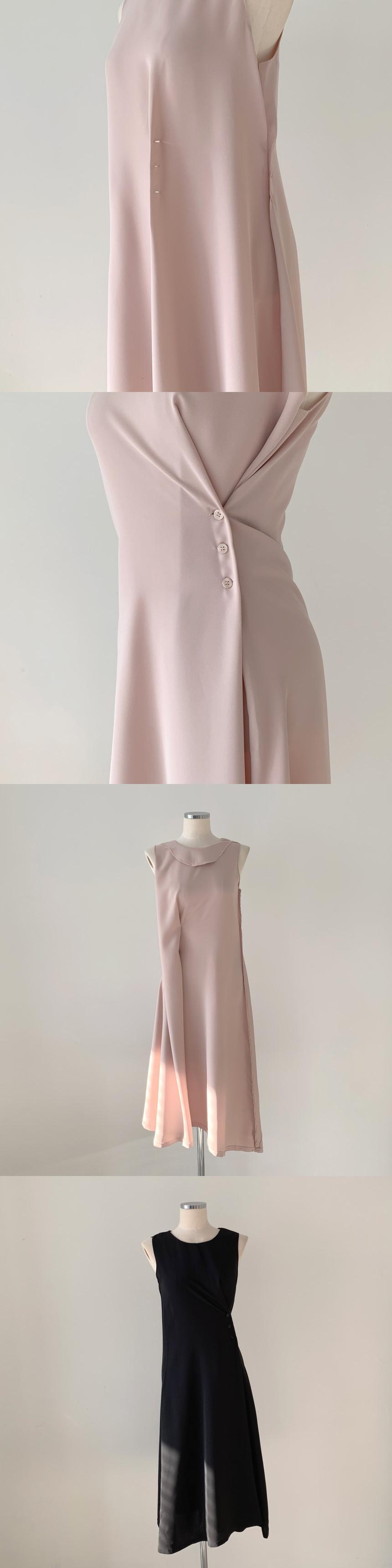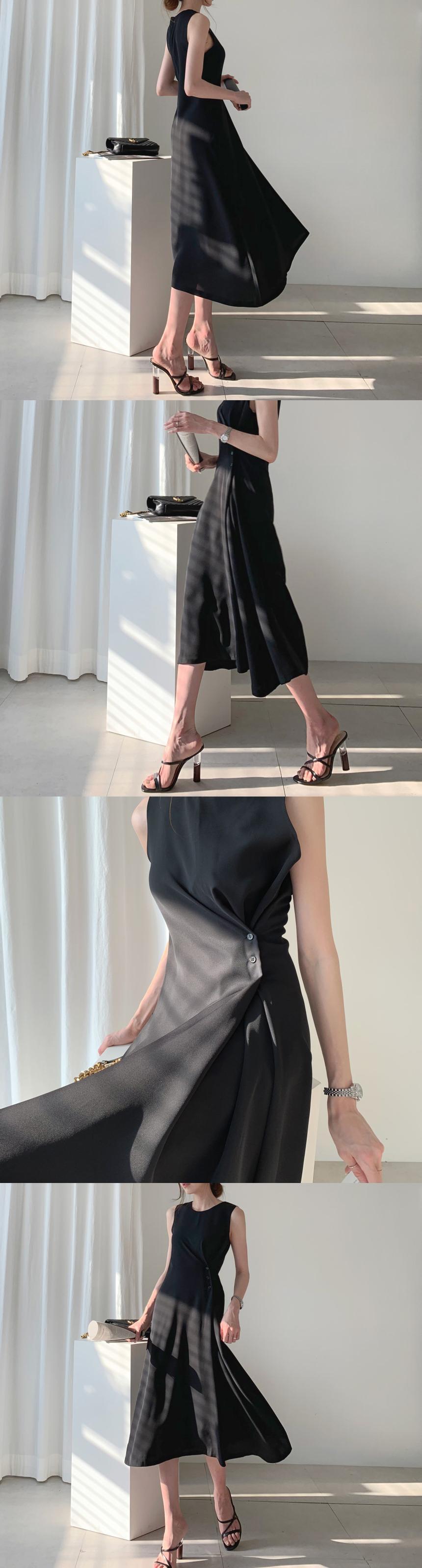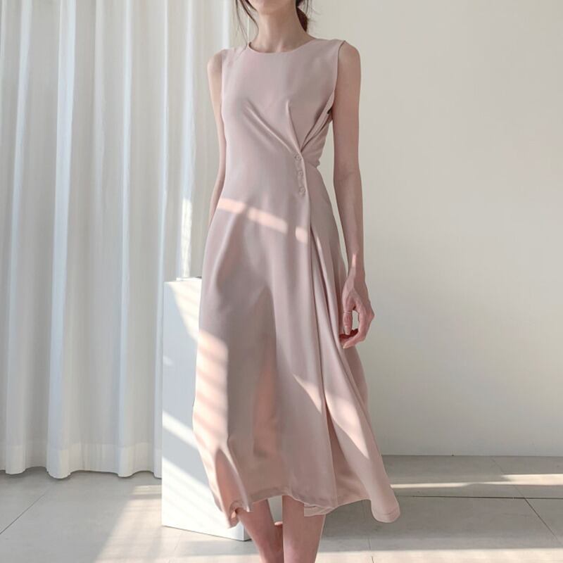シックなフレンチエレガントなラウンドネックデザインサイド3ボタンスリムウエストミドル丈ベストドレス女性 韓国婦人34474031058
