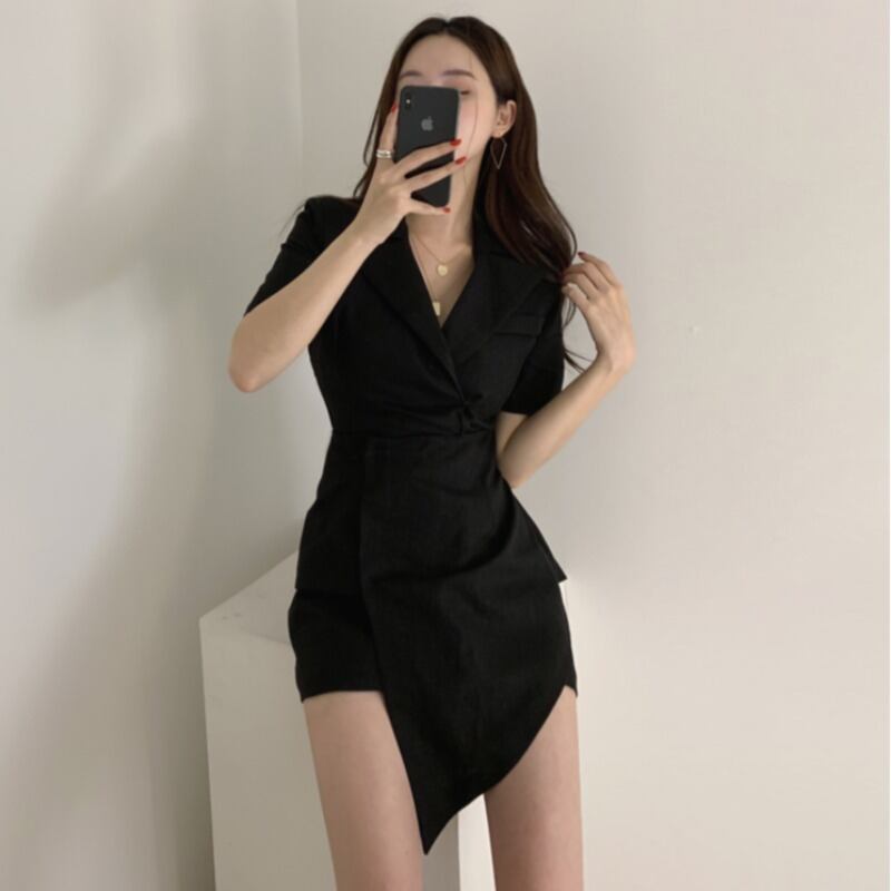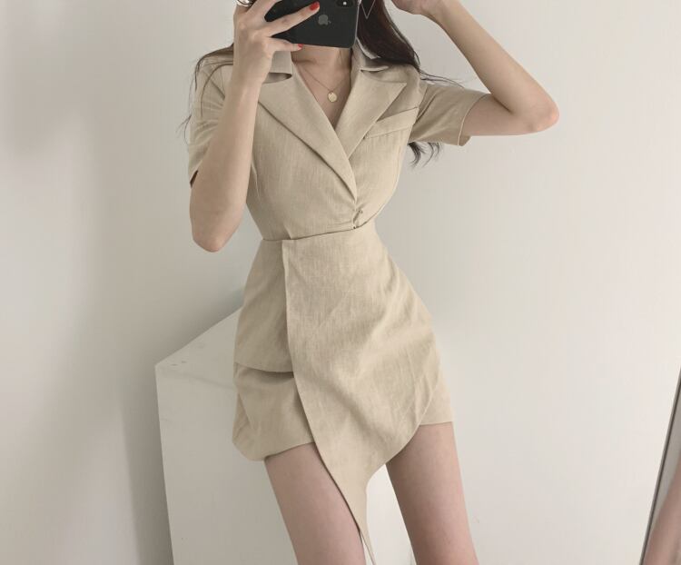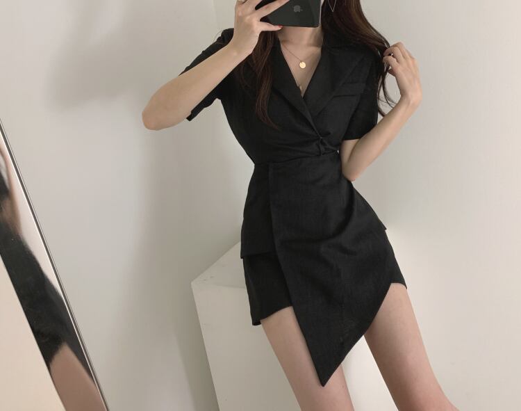 シックな夏のレトロな光成熟した気質不規則なスーツの襟は薄いボタンウエスト半袖ドレス女性でした 韓国婦人30888050119