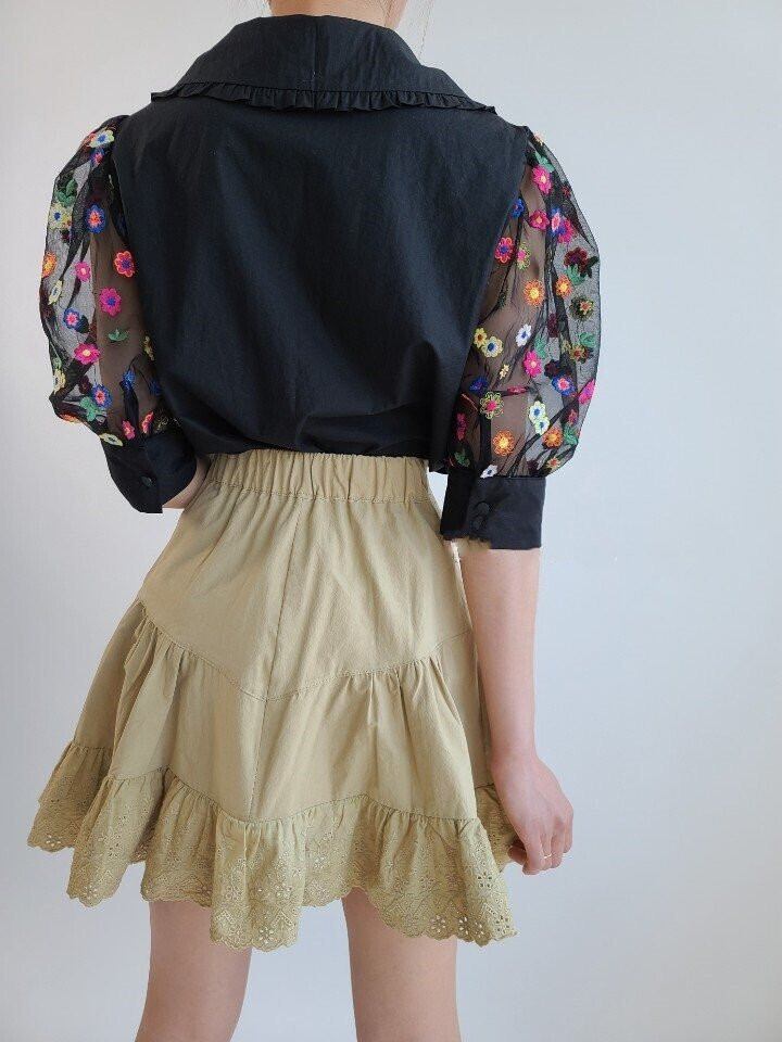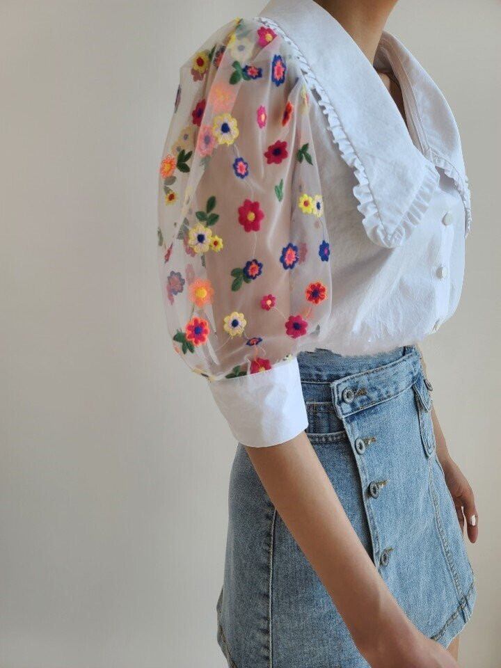 2020年夏の新しい人形の襟ヘビークラフトパフスリーブシャツメッシュ刺繡小さなデイジーシャツ女性 韓国婦人13843869268