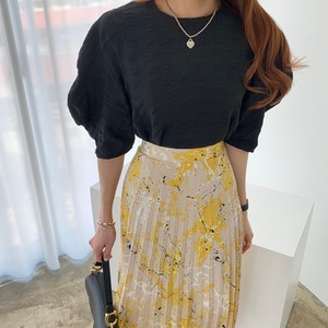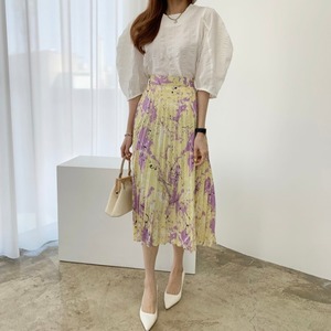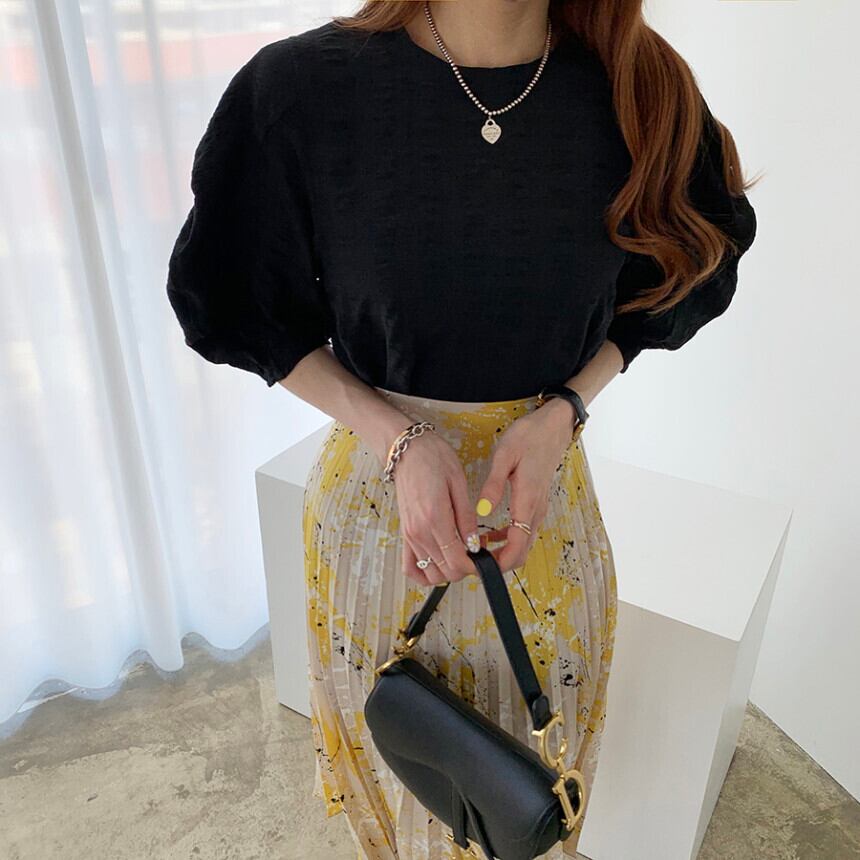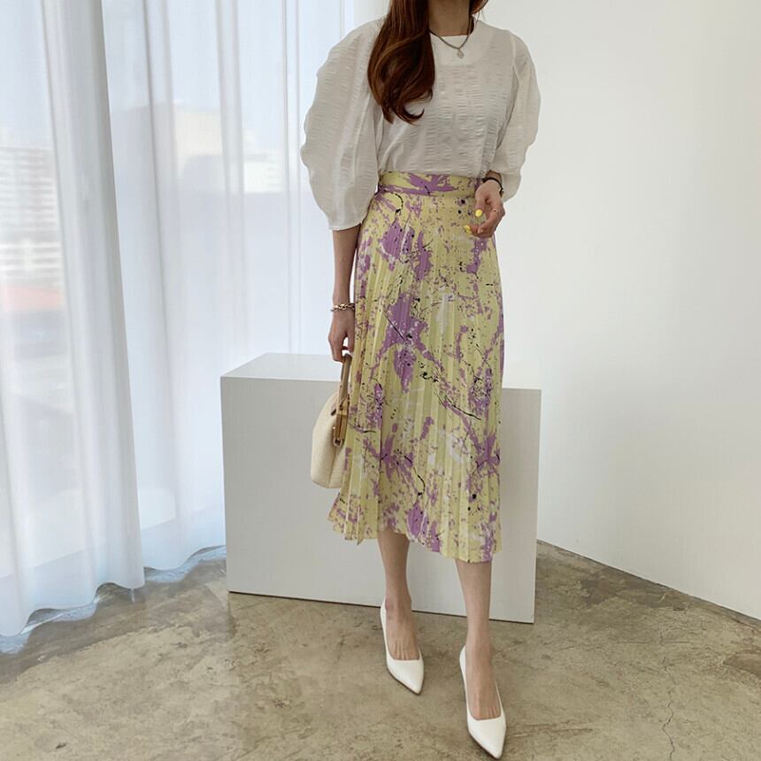 シックなレトロなラウンドネックプリーツパフスリーブシャツ女性+ハイウエスト絞り染めプリントプリーツスカート女性 韓国婦人6291085510