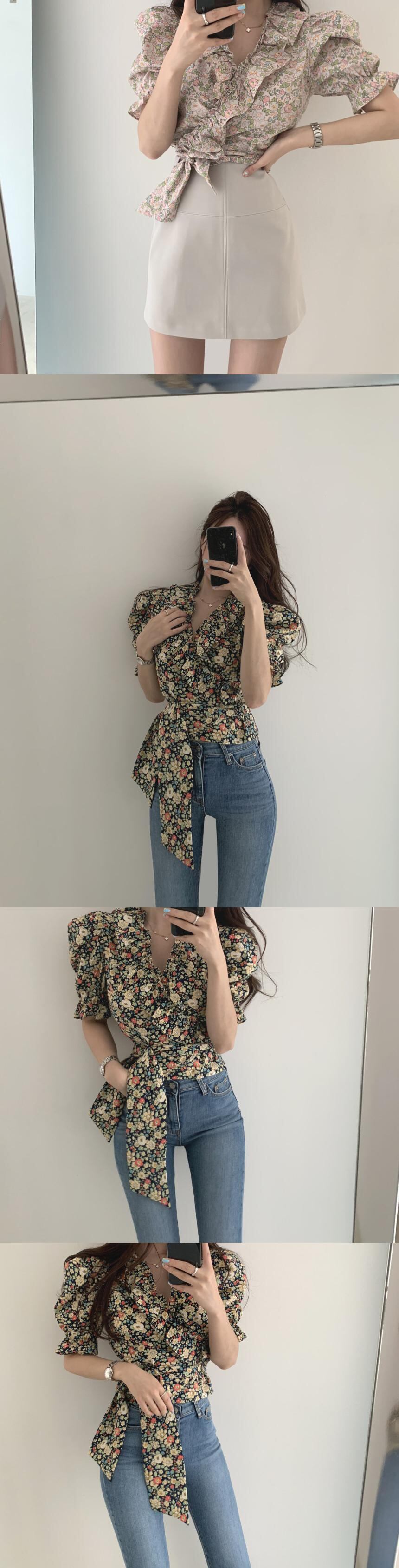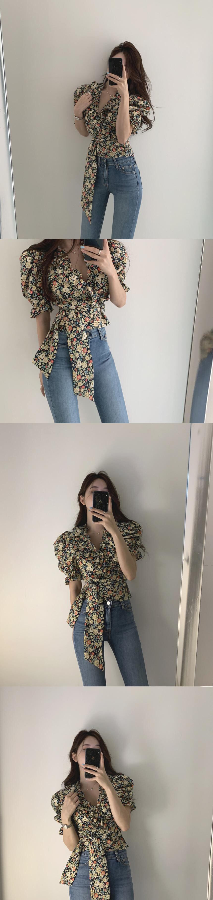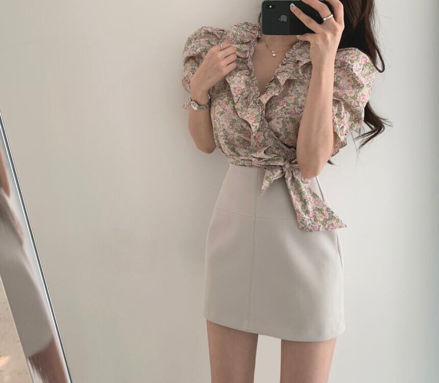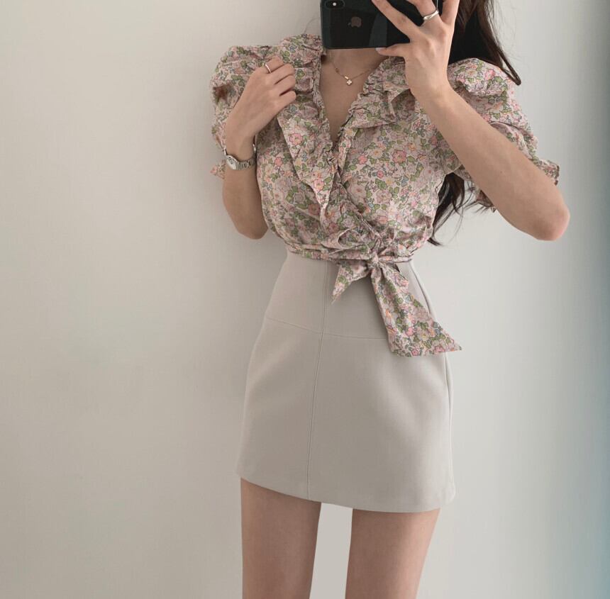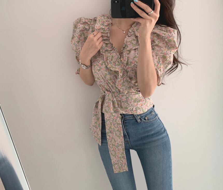 シックなレトロなパレススタイルのVネッククロスフリルネクタイウエストパフスリーブショートフローラルシャツ女性 韓国婦人71881159754