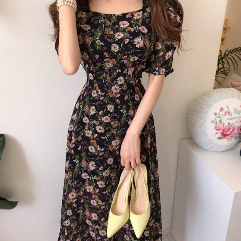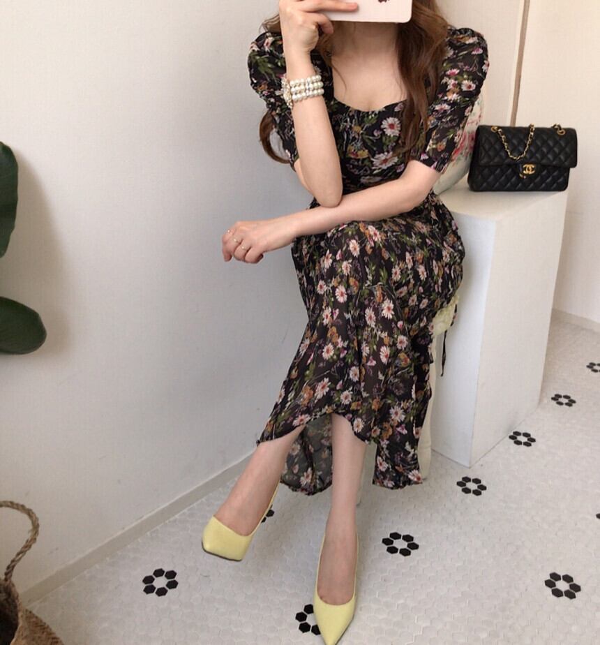 ベルフラワースカート女性2020年夏新気質フレンチニッチレトロスクエアカラー半袖ウエストシフォンフローラルドレス 韓国婦人57547612720
