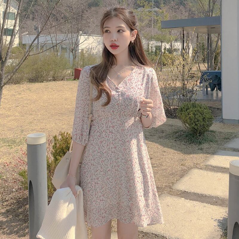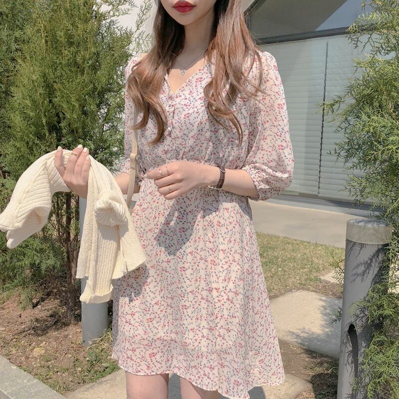 シックなレトロな洋風スモールフローラルVネックハイウエストシンシフォンドレスショートスカートメス 韓国婦人8843752095