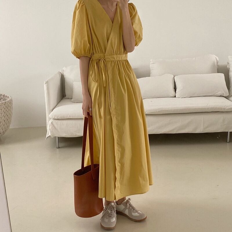 レトロなフレンチベルフラワースカート、ワンピースウエスト、細い気質、パフスリーブミドル丈ドレス 韓国婦人46321476731