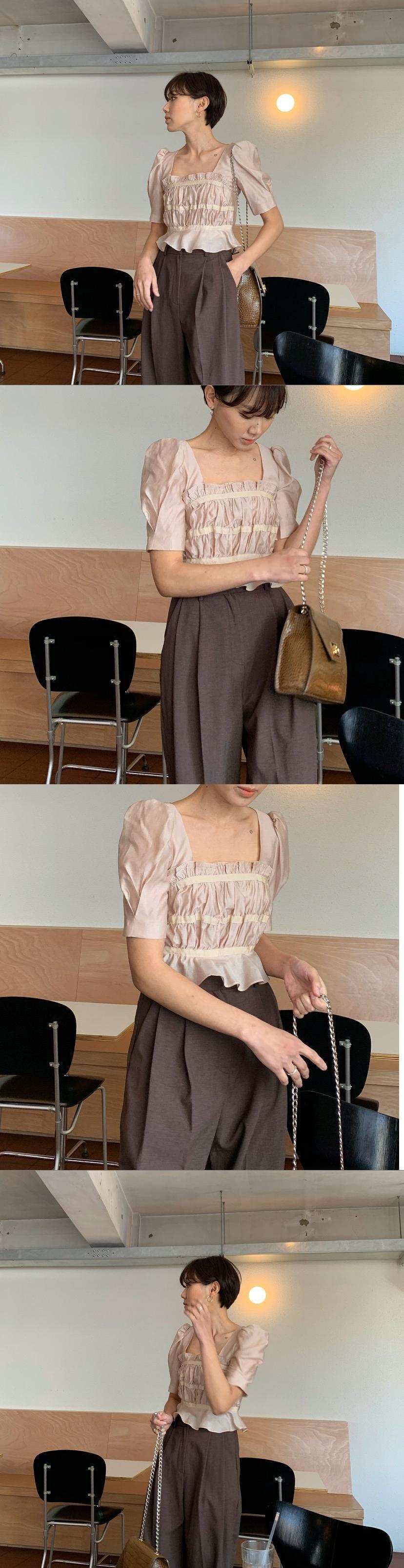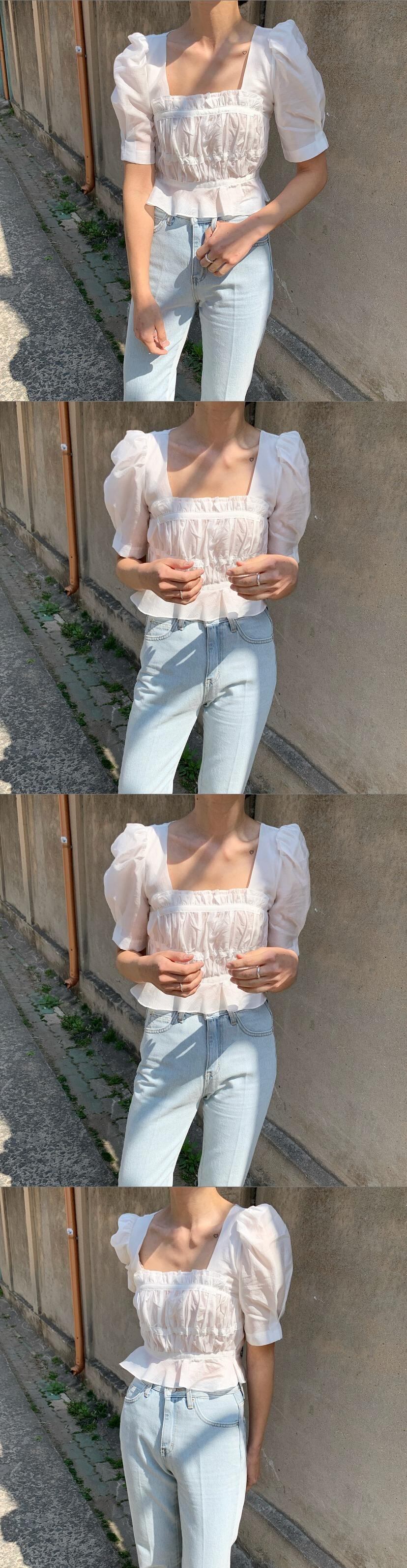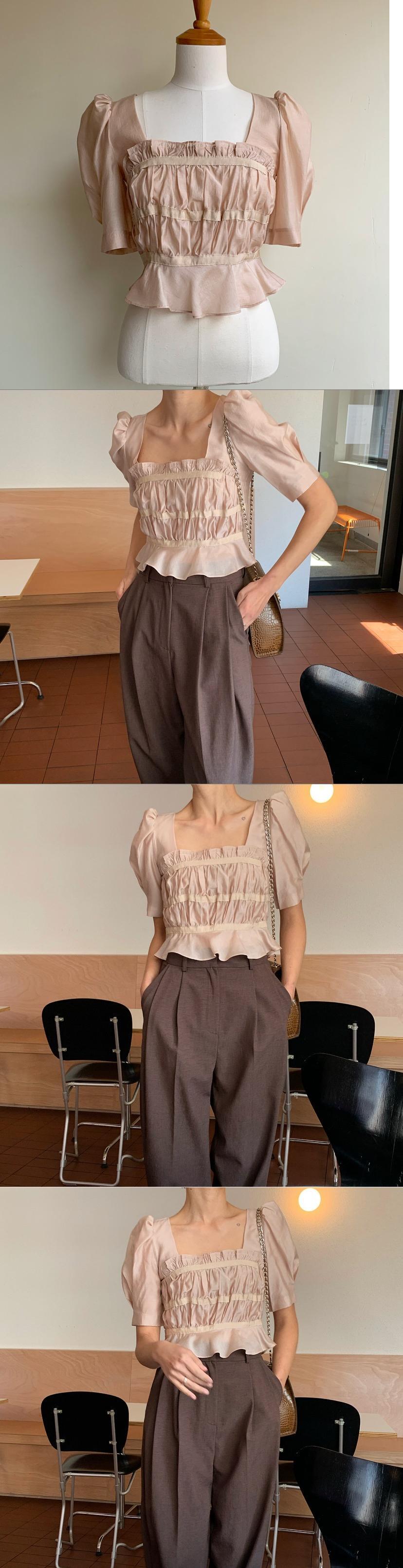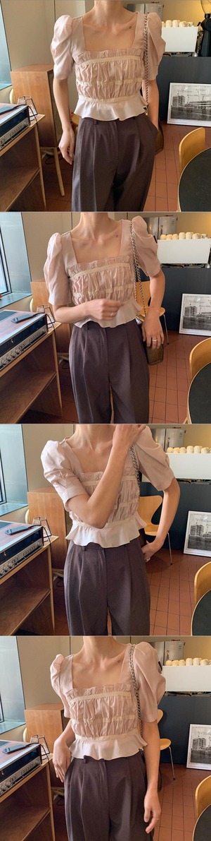 シックで優しいレトロなスリミングスクエアネックプリーツスリミングフリルパフスリーブショートシャツ、木製の耳付き 韓国婦人3728166315