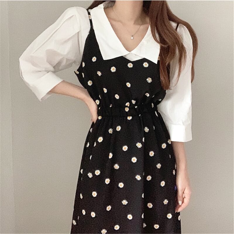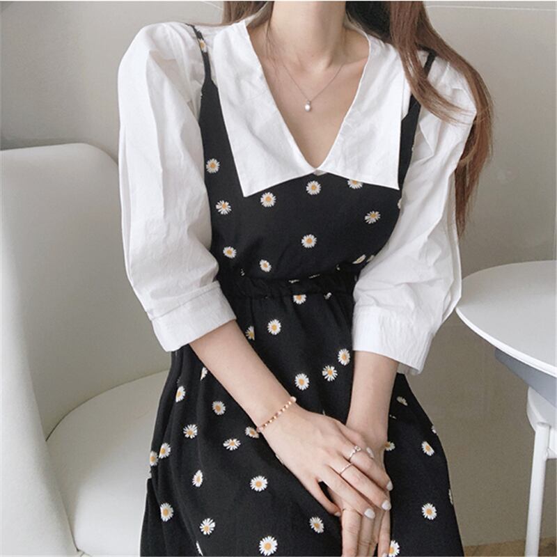 insサマーワイルドルーズラペルパフスリーブシャツ+小さなデイジーウエストウエストVネックスリングドレス女性 韓国婦人17228735035