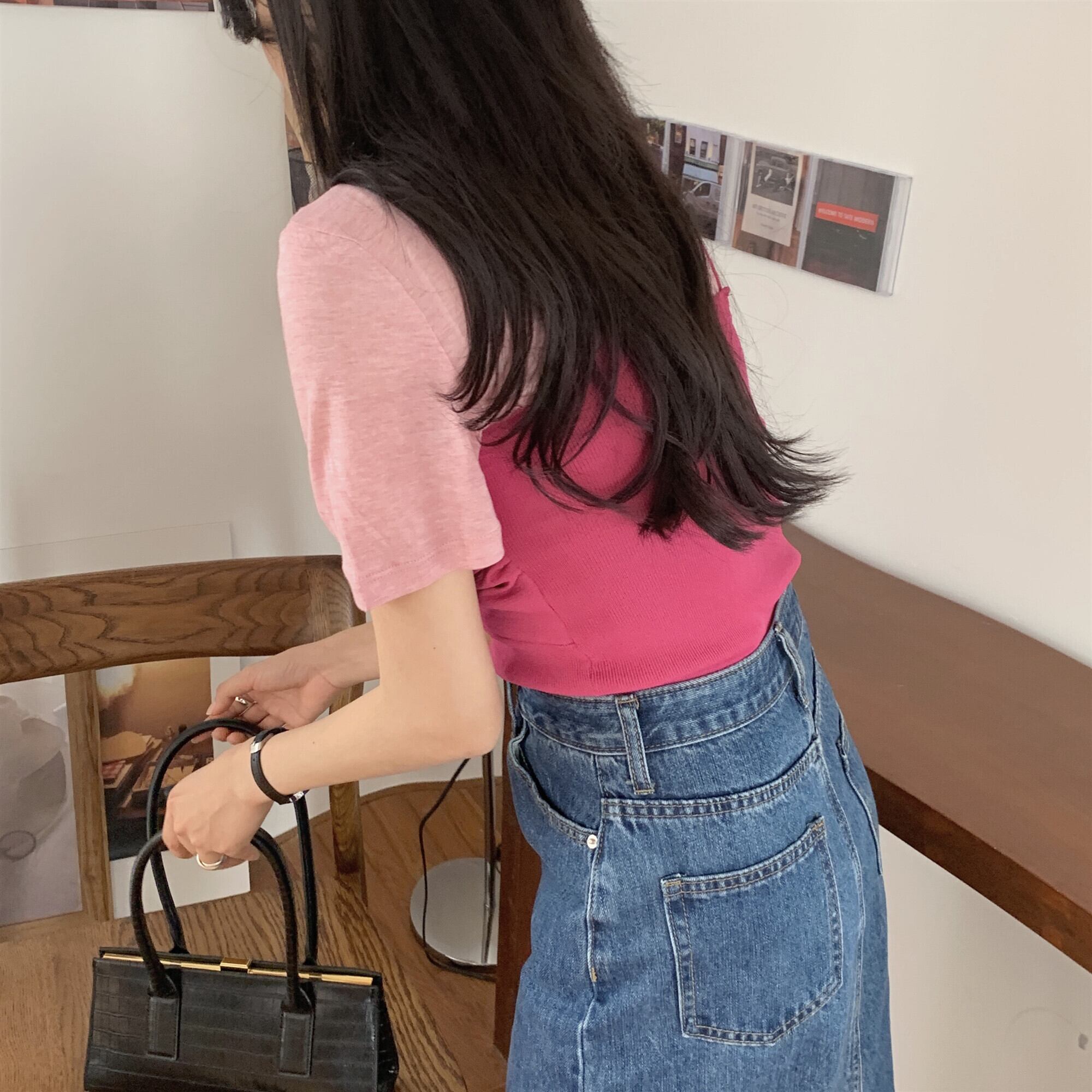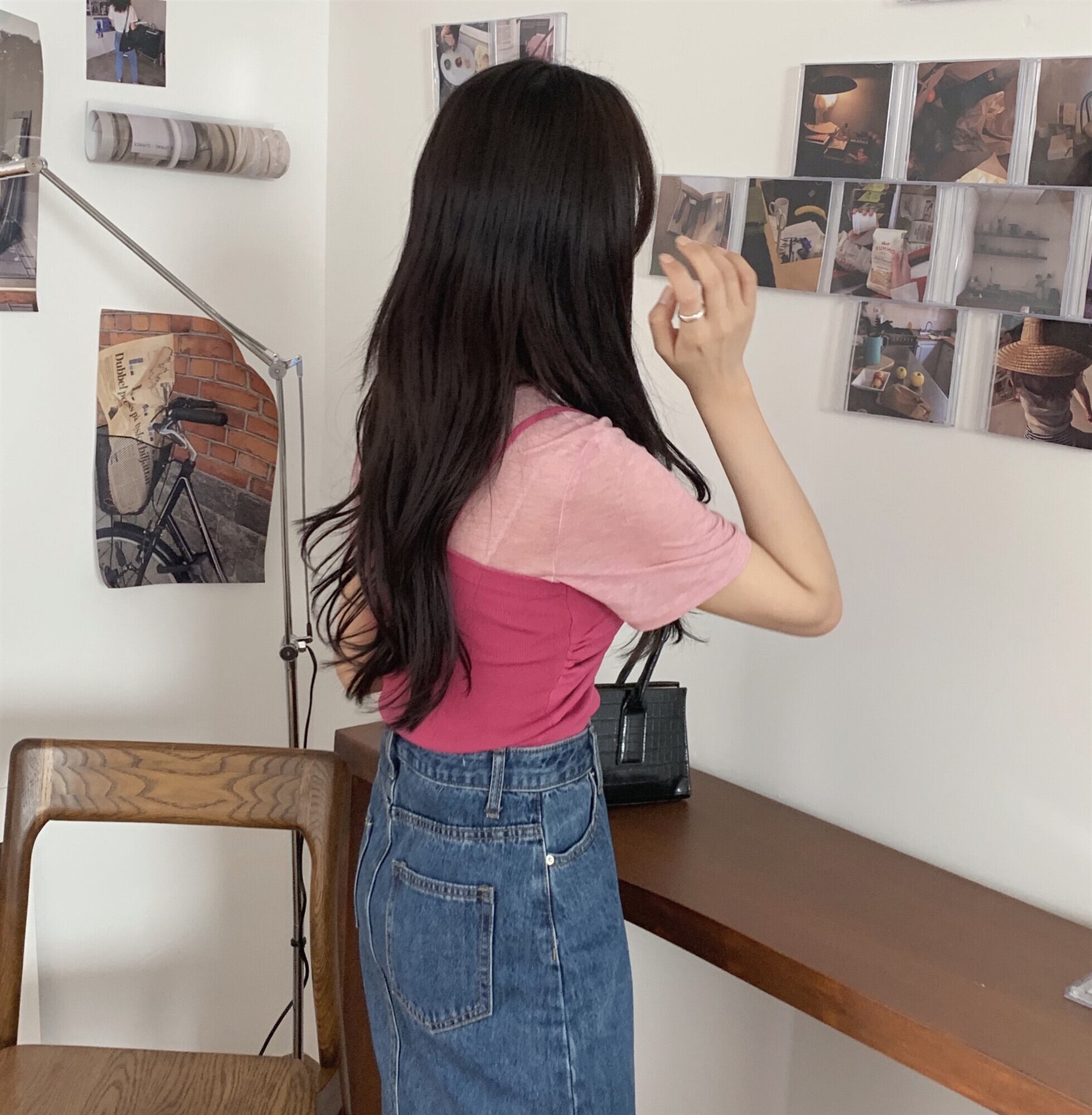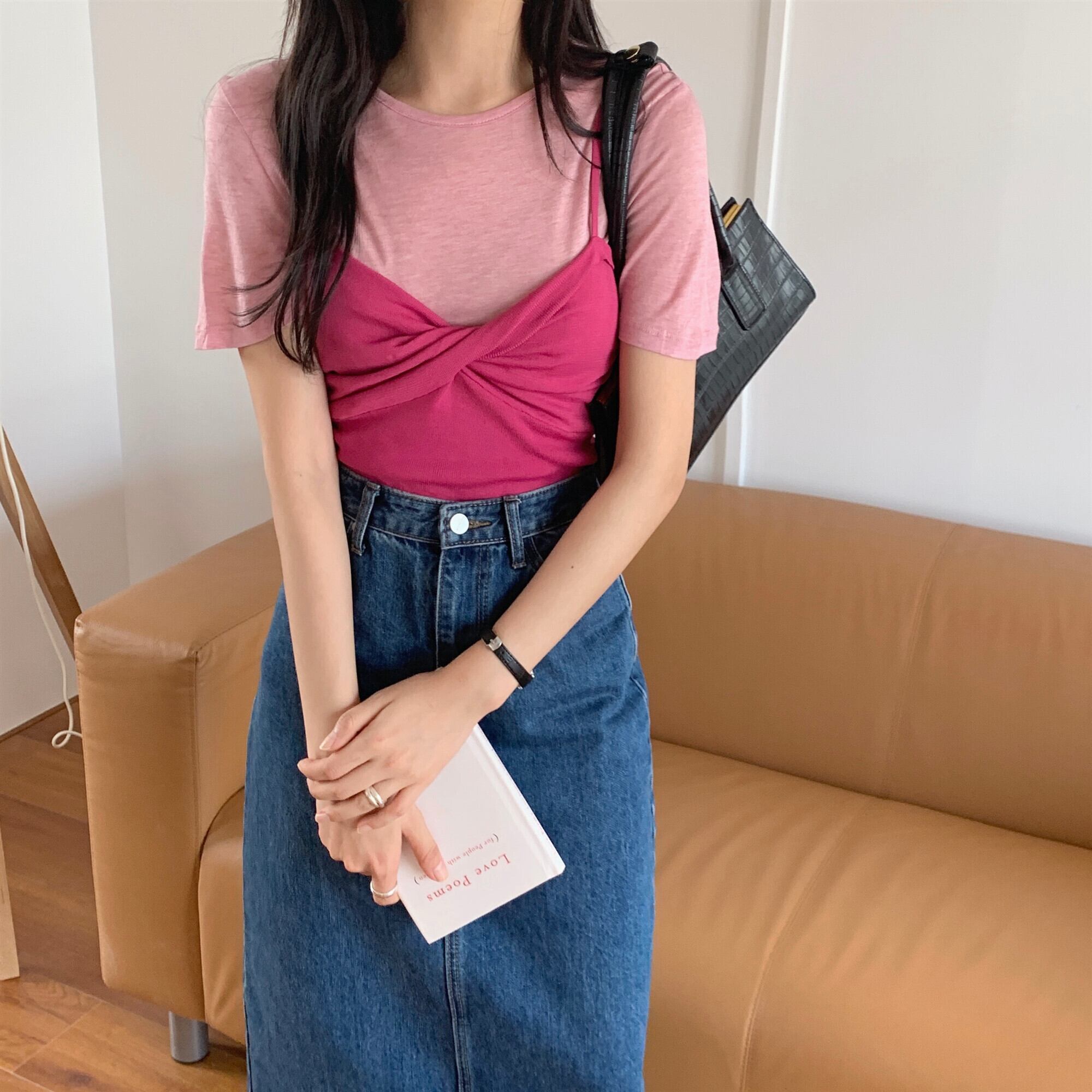 シックなスモールシンスリムフィット半袖Tシャツ+デザインVネックツイストサスペンダーベストスーツ 韓国婦人46130324723
