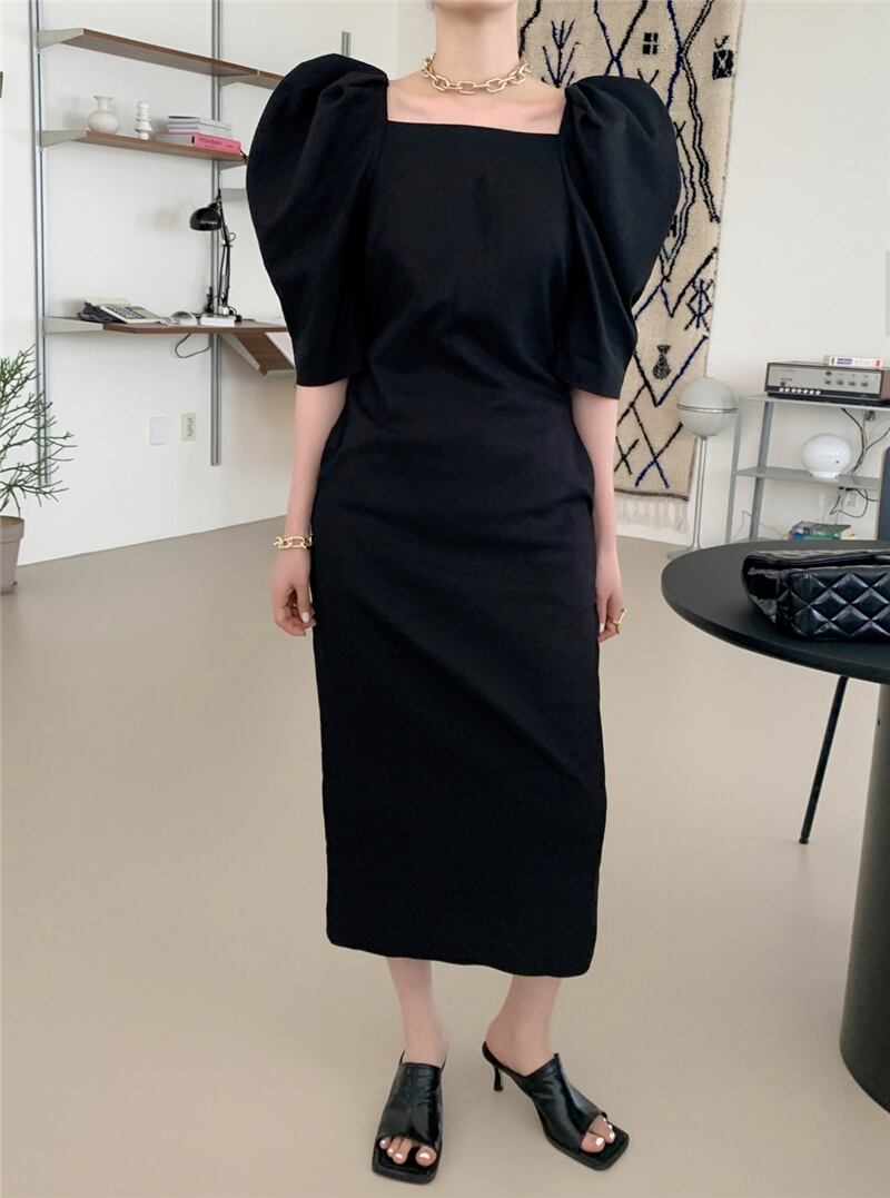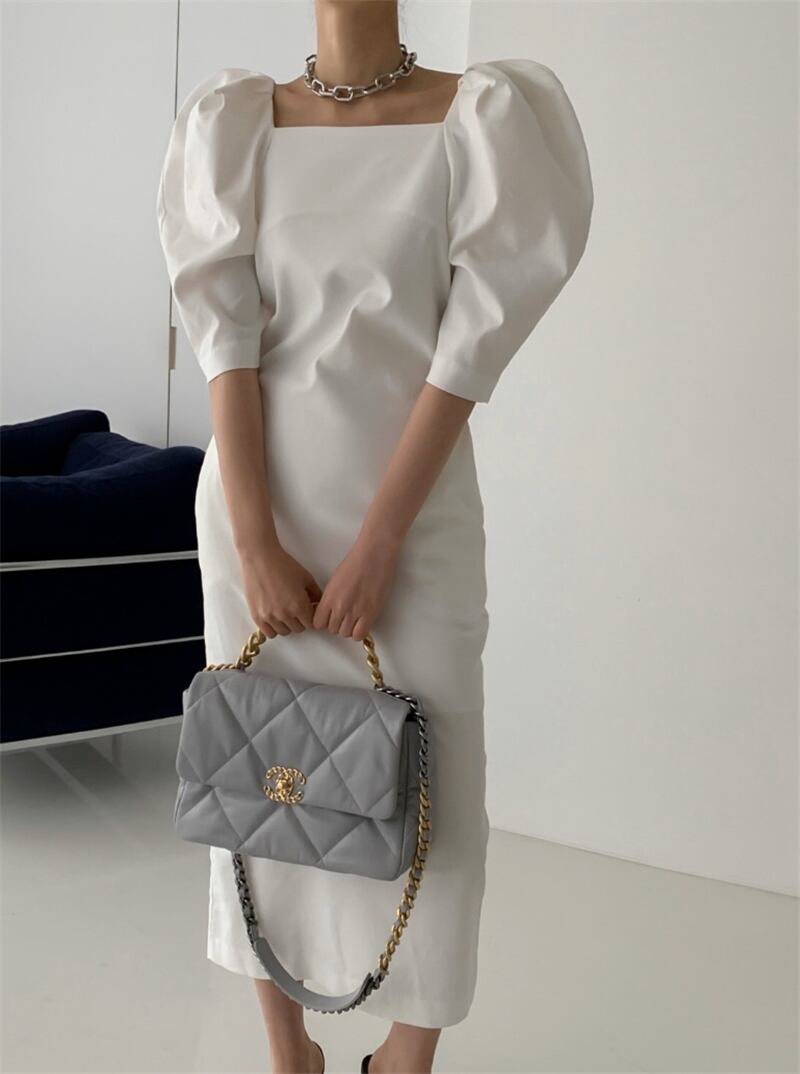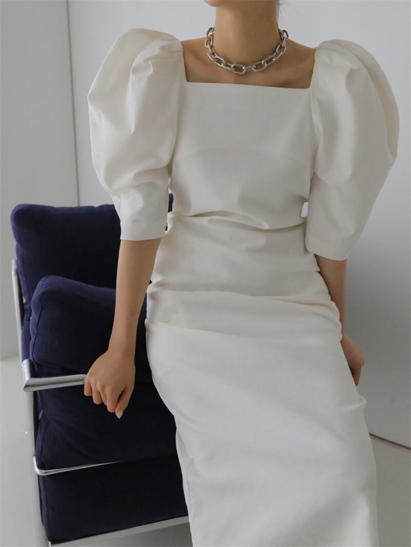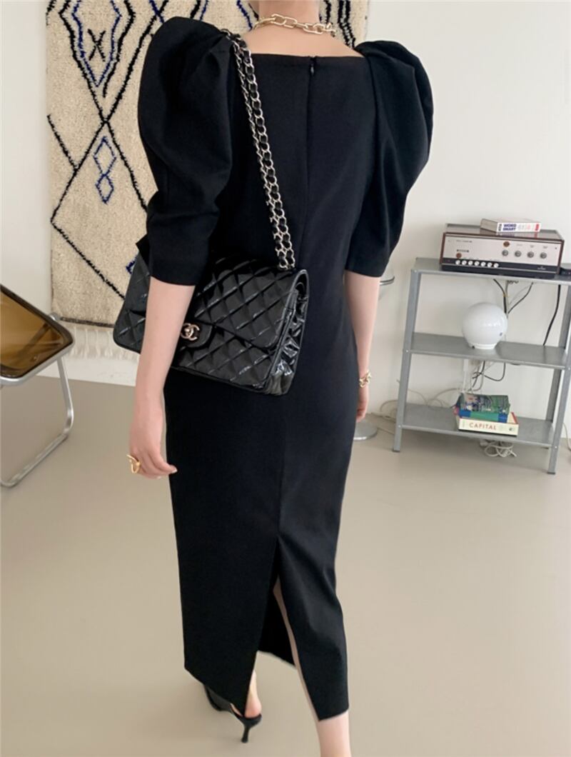 2020年夏レトロスクエアカラーデザインふくらんでいる袖裾スプリットオールマッチミドルスリーブオールマッチドレスレディース 韓国婦人44779182965