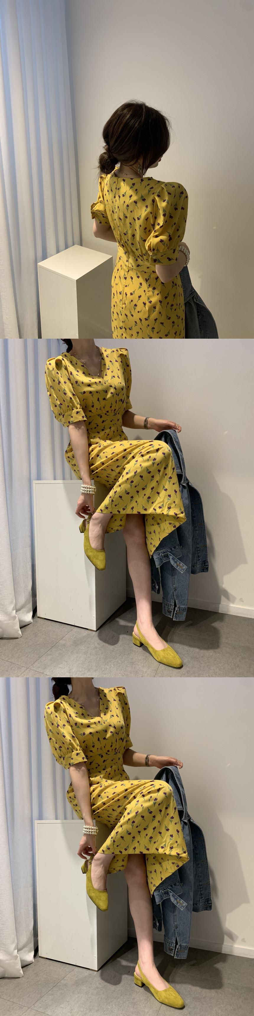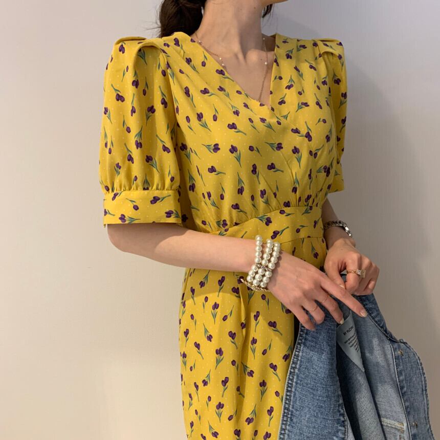 シックなフレンチエレガントなフルスクリーン小さな花柄の細いVネックウエストロング膝丈パフスリーブドレス女性 韓国婦人53010285074