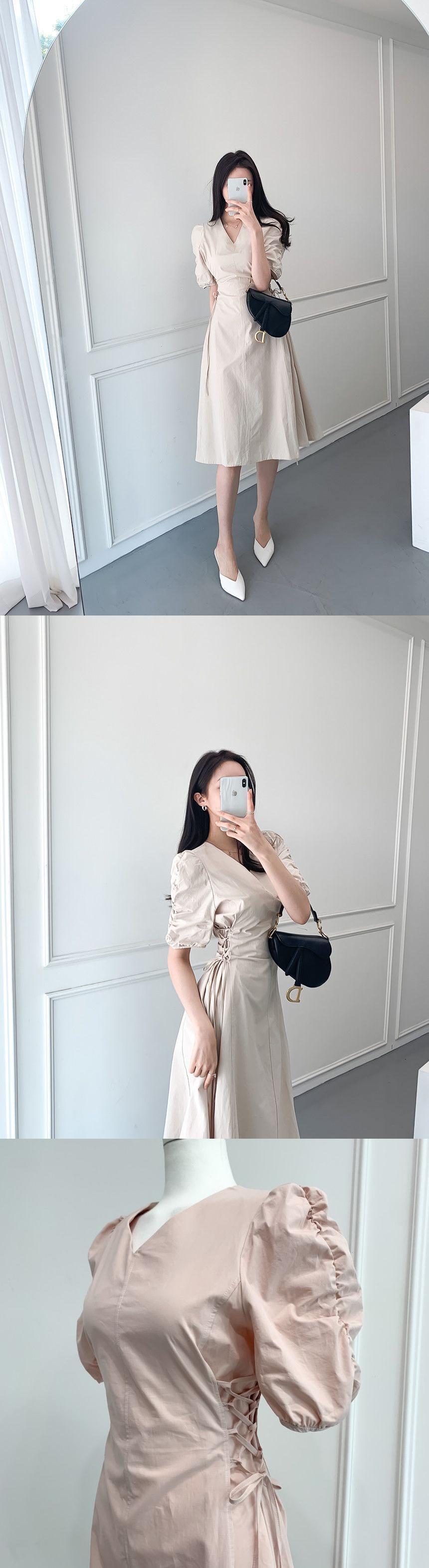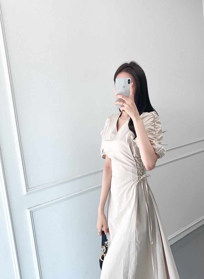 シックなニッチレトロVネックシンナーサイド包帯ウエストミドル丈A字型パフスリーブワンピース女性 韓国婦人33868952879