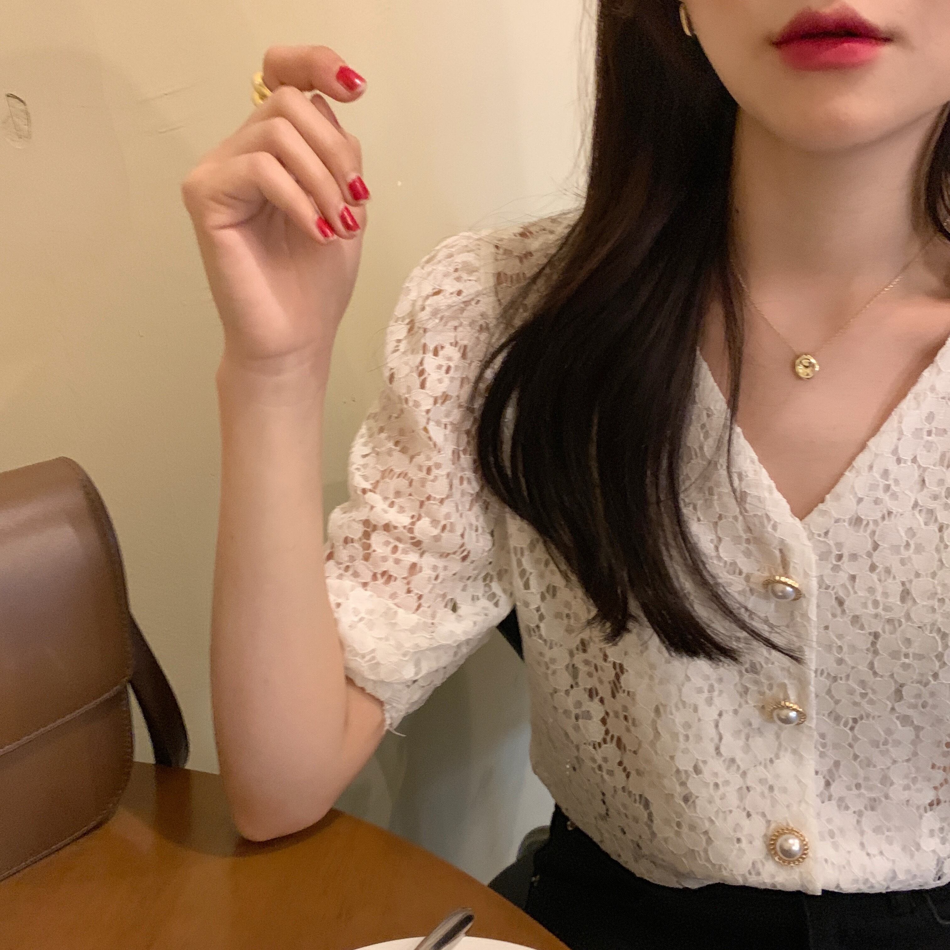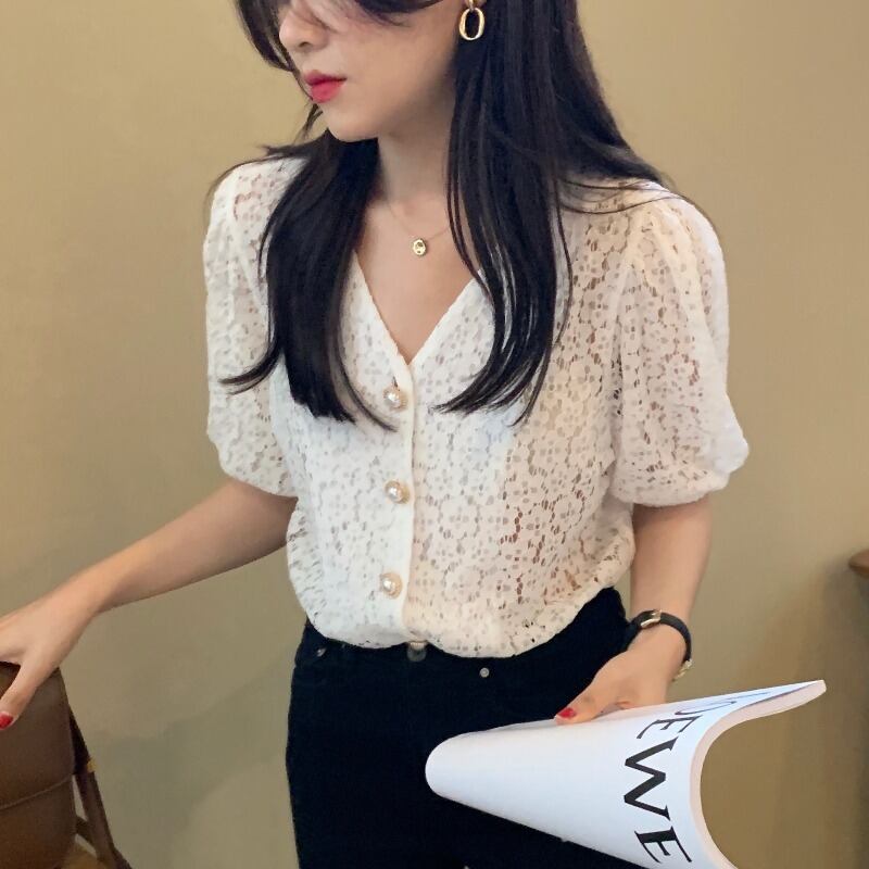 半袖レースブラウスレディースサマーバージョンの年齢を減らす洋風フックフラワー中空カーディガンスモールシャツデザインセンスニッチトップス 韓国婦人9659715256