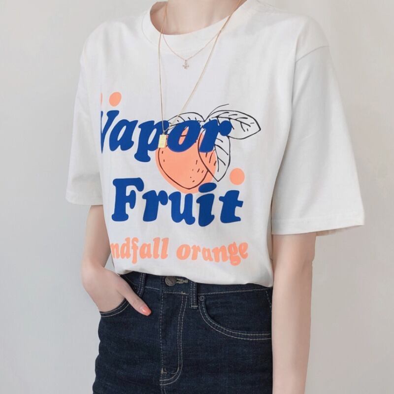 オレンジ〜さわやかなフルーツプリントTEE半袖オルチャンレトロカレッジルーズラウンドネックTシャツ 韓国婦人4098015681