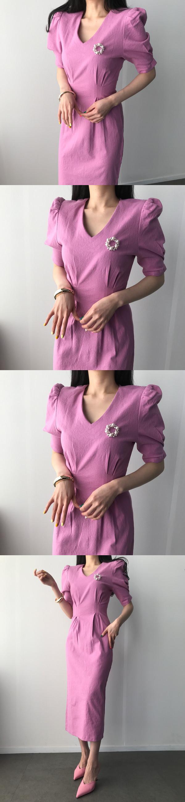 シックで優しいバイオレットスリミングVネックプリーツスリムウエストロングスプリットパフスリーブドレスレディース 韓国婦人9337163893