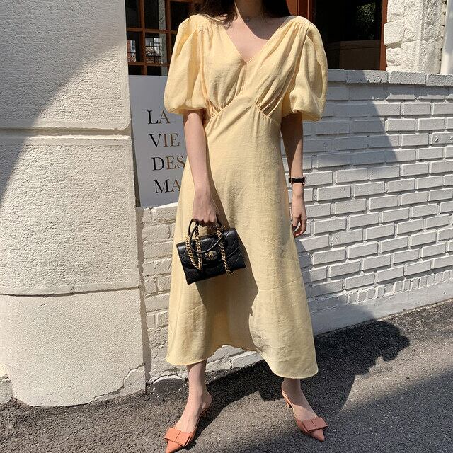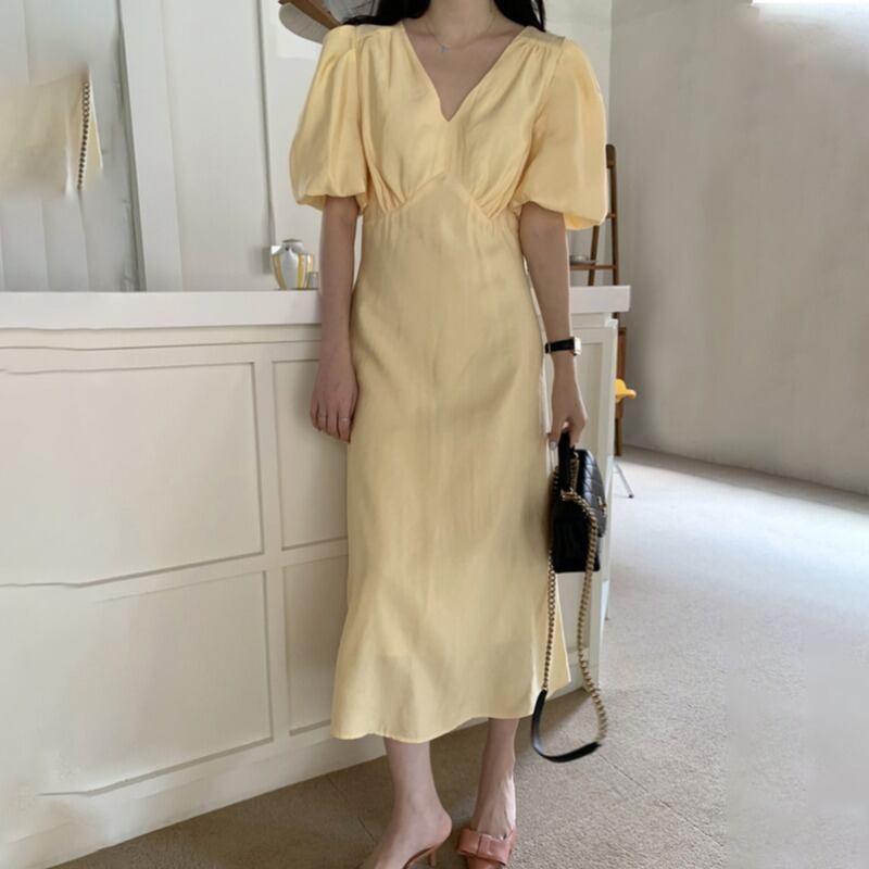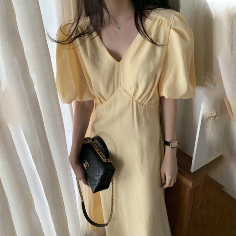 シックなフレンチレトロホワイトイエローフォールドVネックハイウエストルーズミドル丈ランタンスリーブドレス女性 韓国婦人39038015009