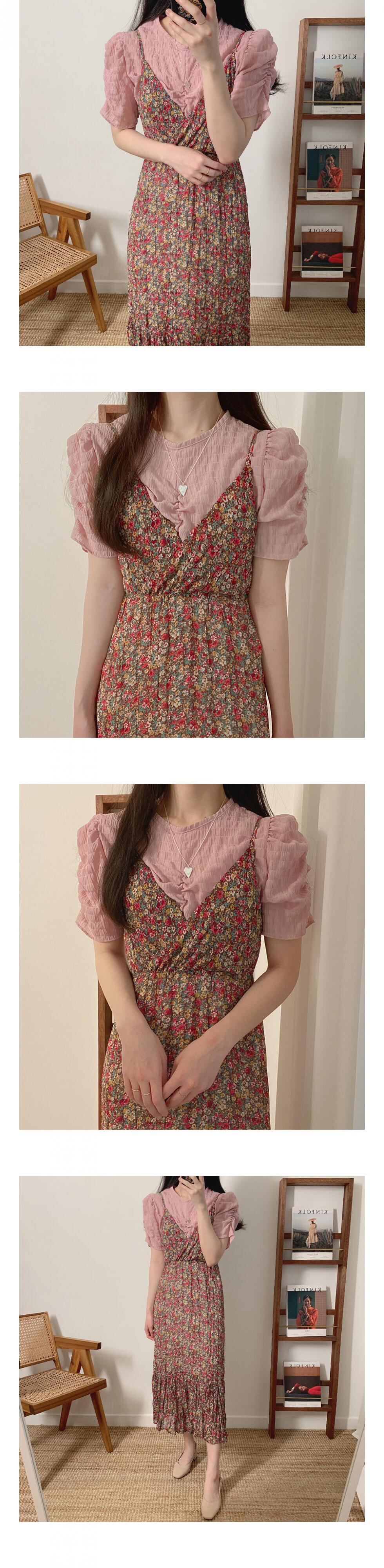 シックでスウィートなラウンドネックプリーツパフスリーブシャツ+薄手のハイウエストスモールフローラルスリングドレススーツ 韓国婦人44628494166