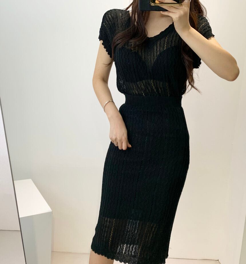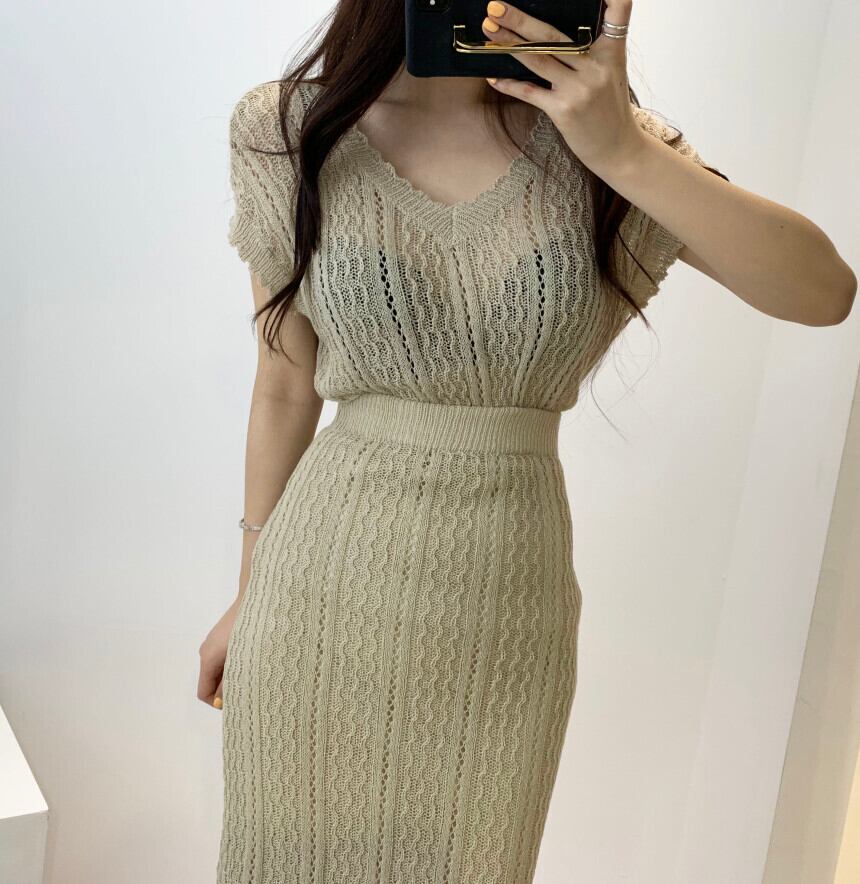 シックでエレガントなVネックの細くて薄い中空ニットセーター+ハイウエストのボディとヒップなミドル丈のスカート 韓国婦人17333642974