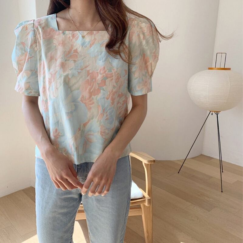 シックな夏のレトロなウエスタンスタイルのスクエアカラーデザインルーズフォールドパフスリーブ水彩花柄シャツトップ女性 韓国婦人17242483516