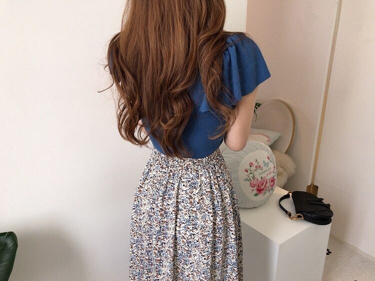 シックなウエスタンスタイルのスタンドアップカラースリムフィットフライングスリーブセーターTシャツ+ハイウエストスモールフローラルスカートロングスカートスーツ 韓国婦人68056970942
