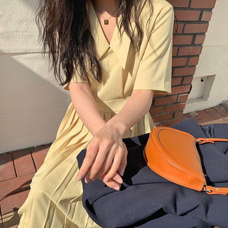 2020年夏の新作インテンダーイエローロングスカート気質は薄いプリーツ半袖ワンピース女性 韓国婦人90367516468