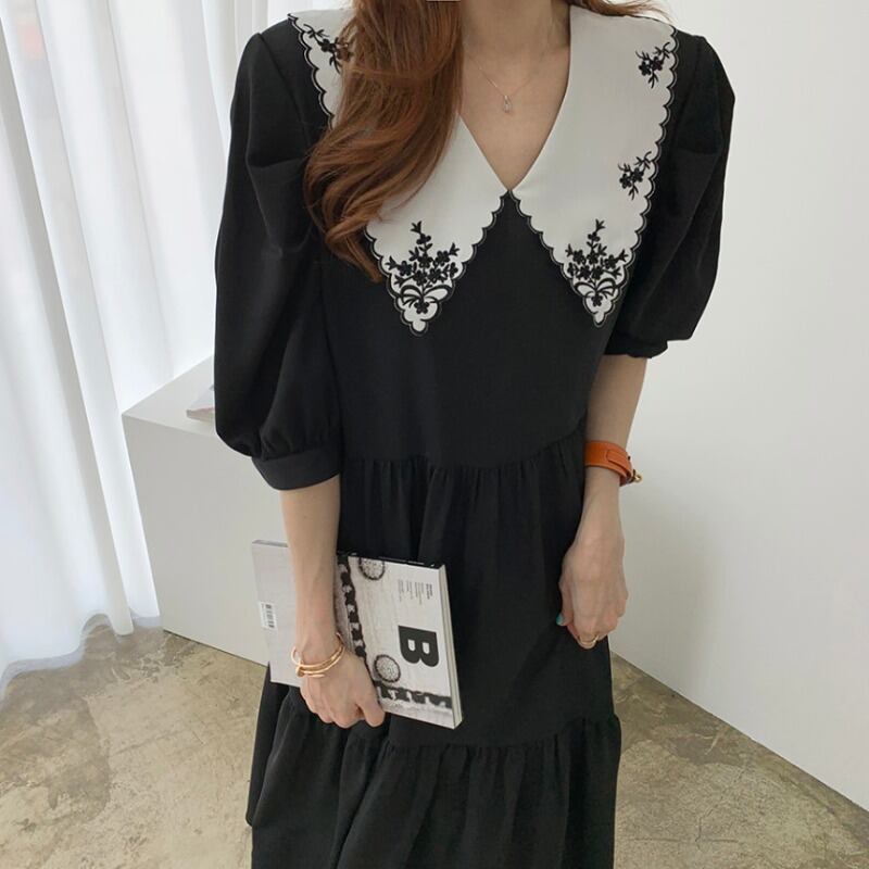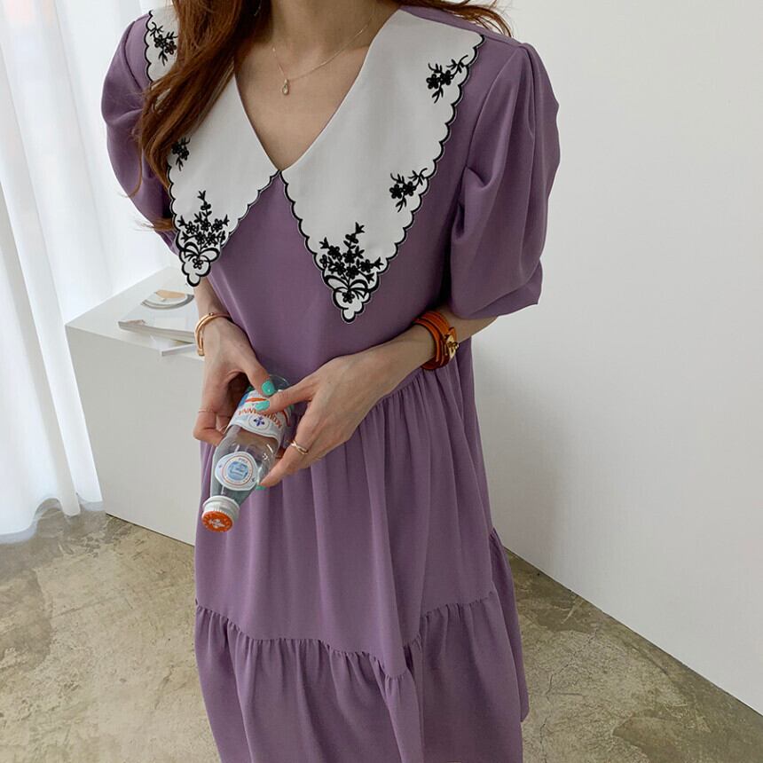 2020年夏の新作ANANレトロフレンチ刺繡ドールカラーパフスリーブウエストスリミングミドル丈ワンピース 韓国婦人64330056809