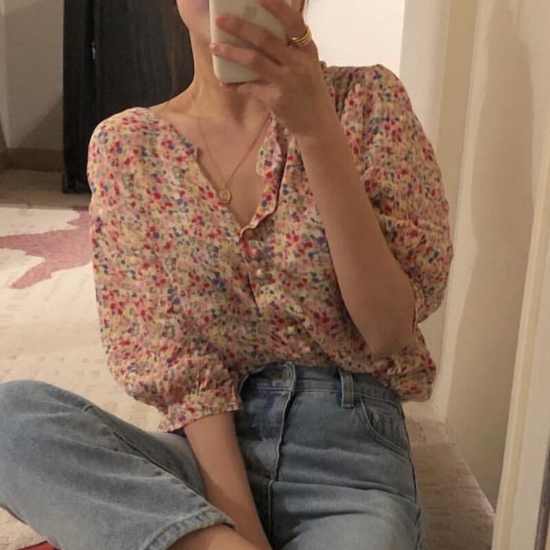夏のシックなレトロな花柄の鎖骨Vネックシャツ5点スリーブシフォンシャツシャツブラウス 韓国婦人99835531142