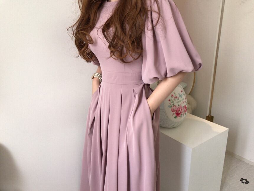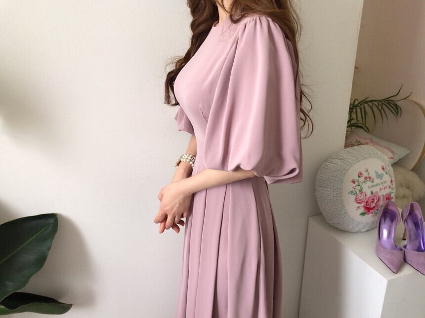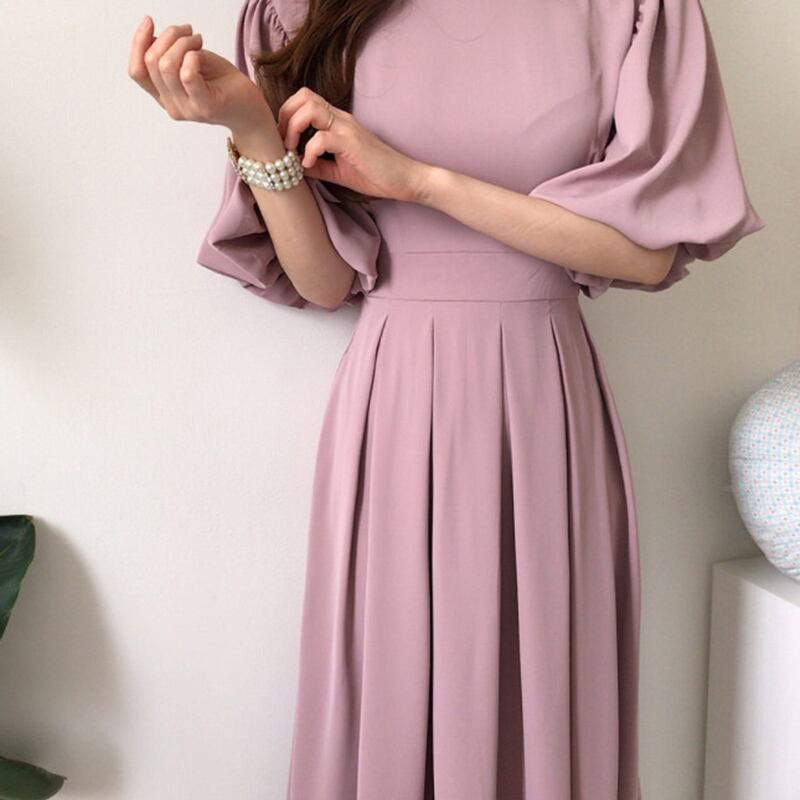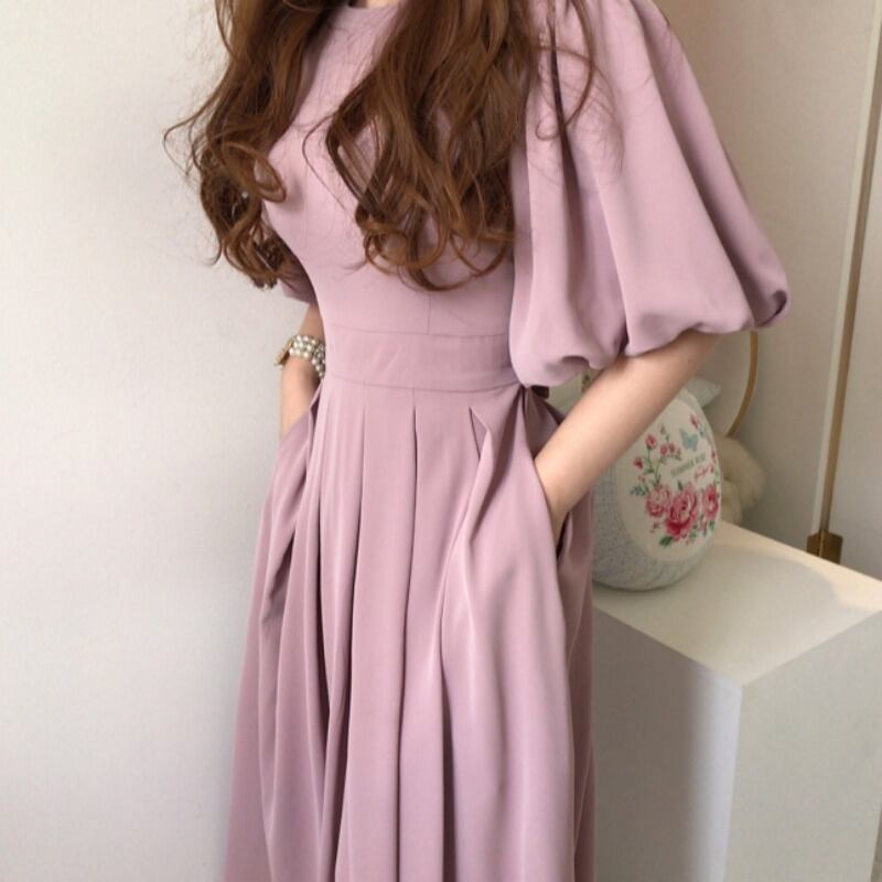 シックなフレンチニッチレトロラウンドネックストラップランタンスリーブプリーツウエスト膝上ロングドレス女性 韓国婦人47032258623