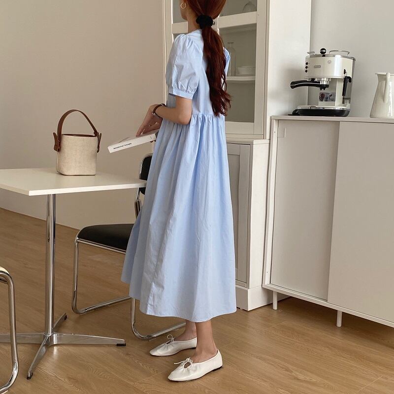 シックなレトロな優しいブルーホワイトのラウンドネックの不規則な折り目ハイウエストルーズパフスリーブドレスロングスカート 韓国婦人5296674904