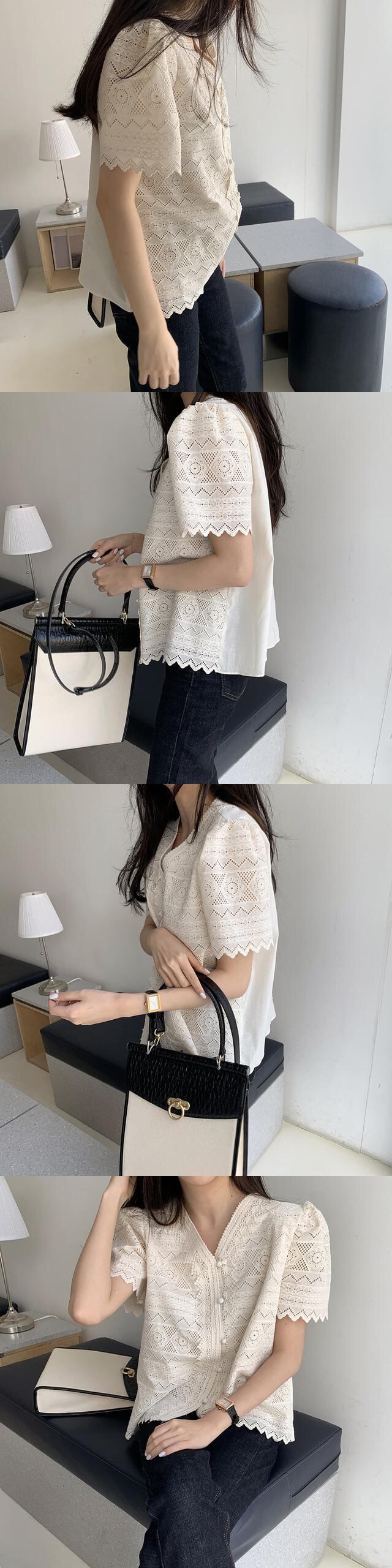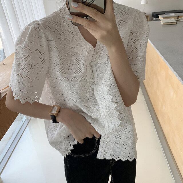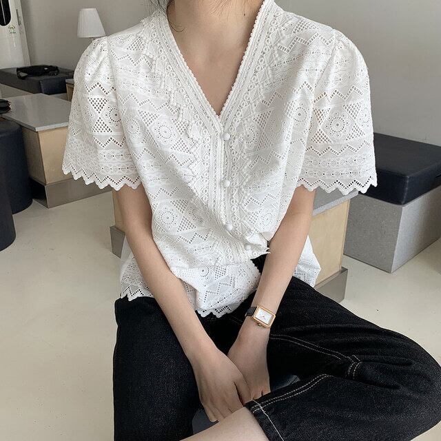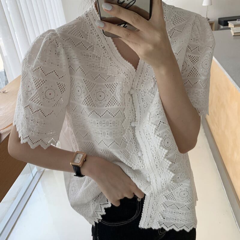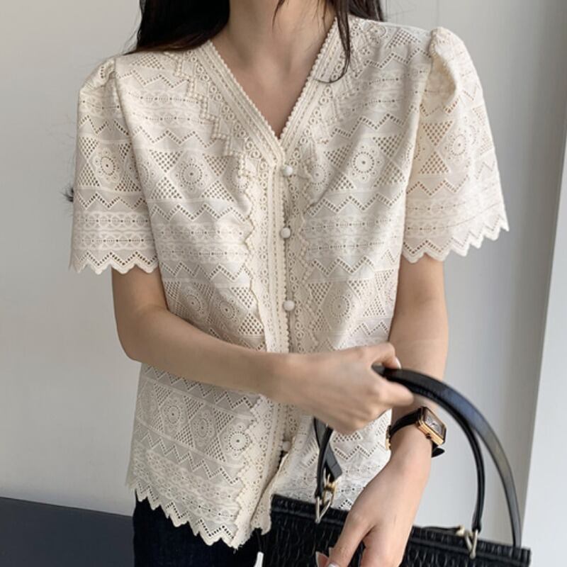 南イン夏ワイルドレトロ重工業刺繍Vネックファッショナブルなレース半袖シャツブラウス 韓国婦人48478474495