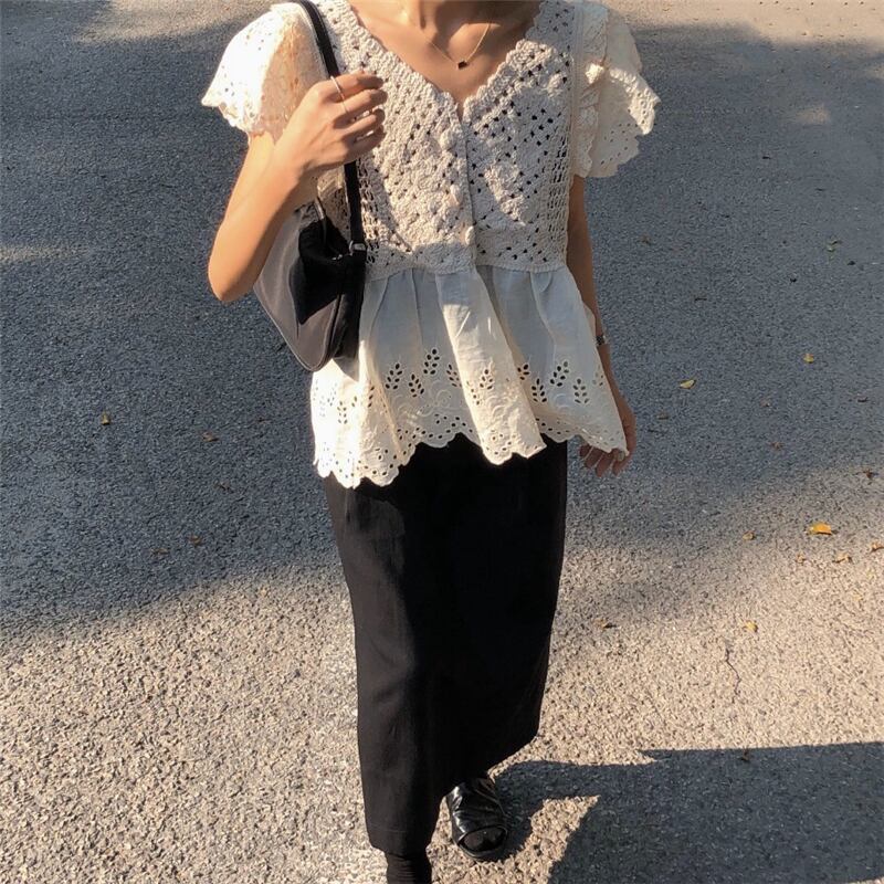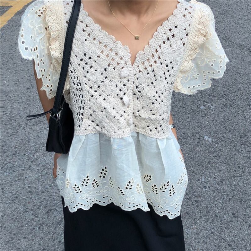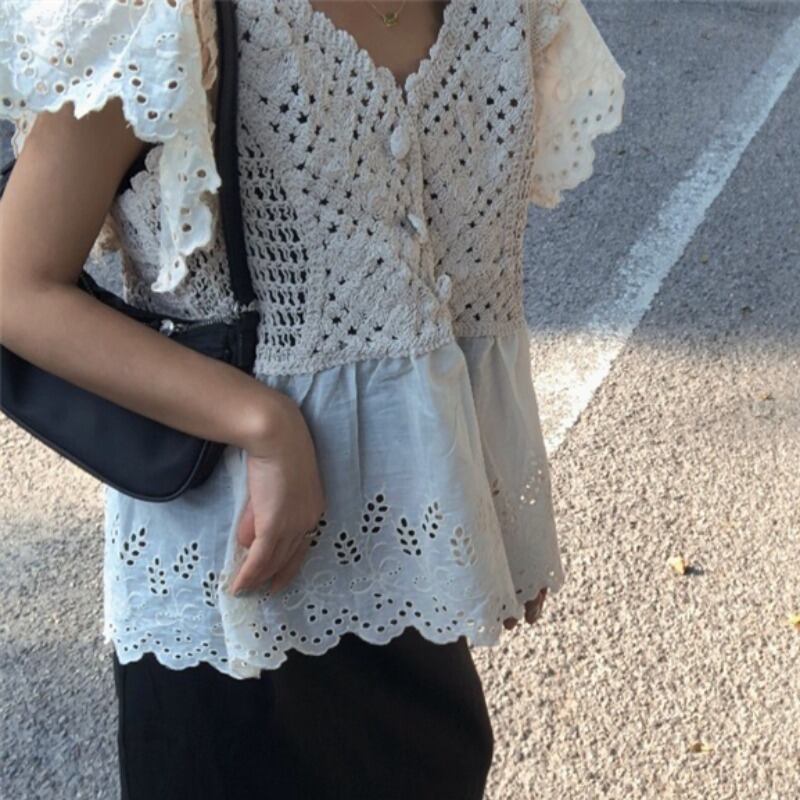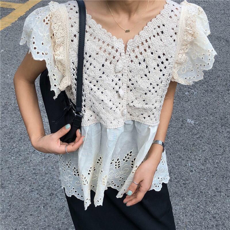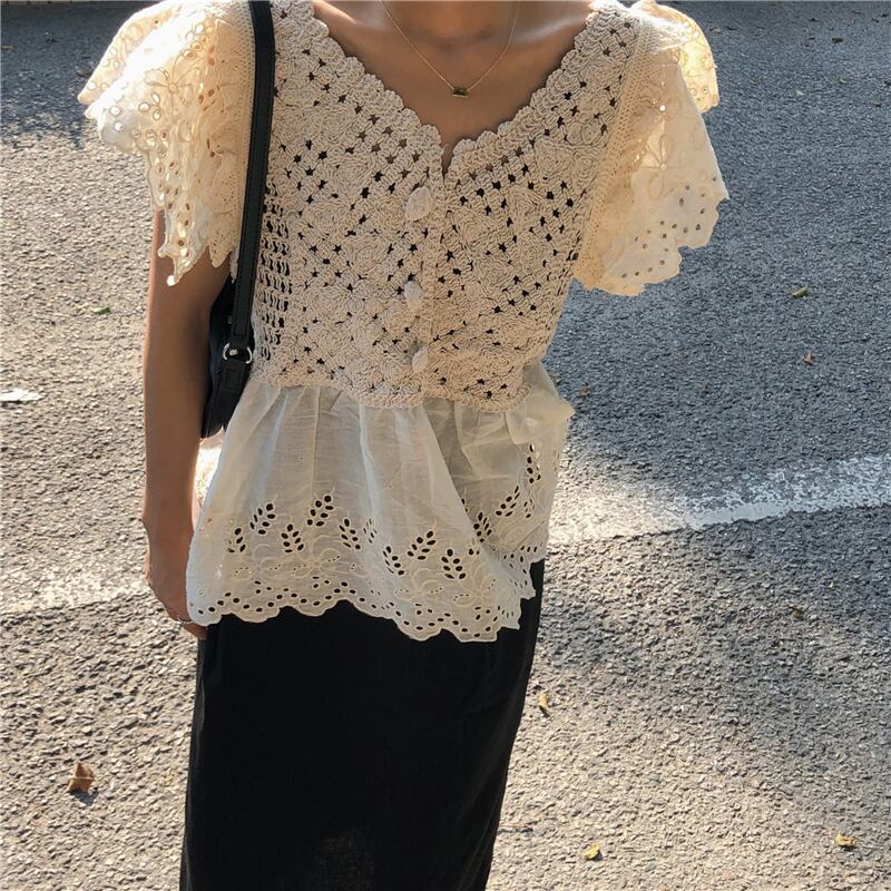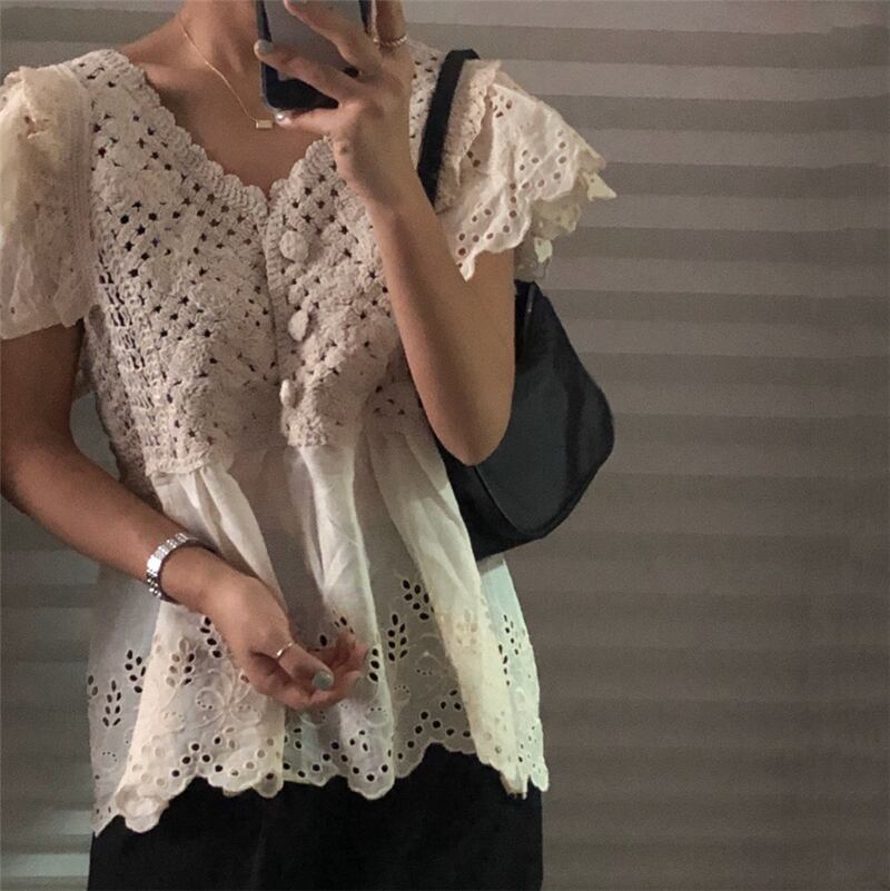 刺繍レースシャツフライングスリーブ2020夏の新しいスタイルの綿とリネンのデザインニッチかぎ針編みのシャツフレンチブラウスの女性 韓国婦人9871246389