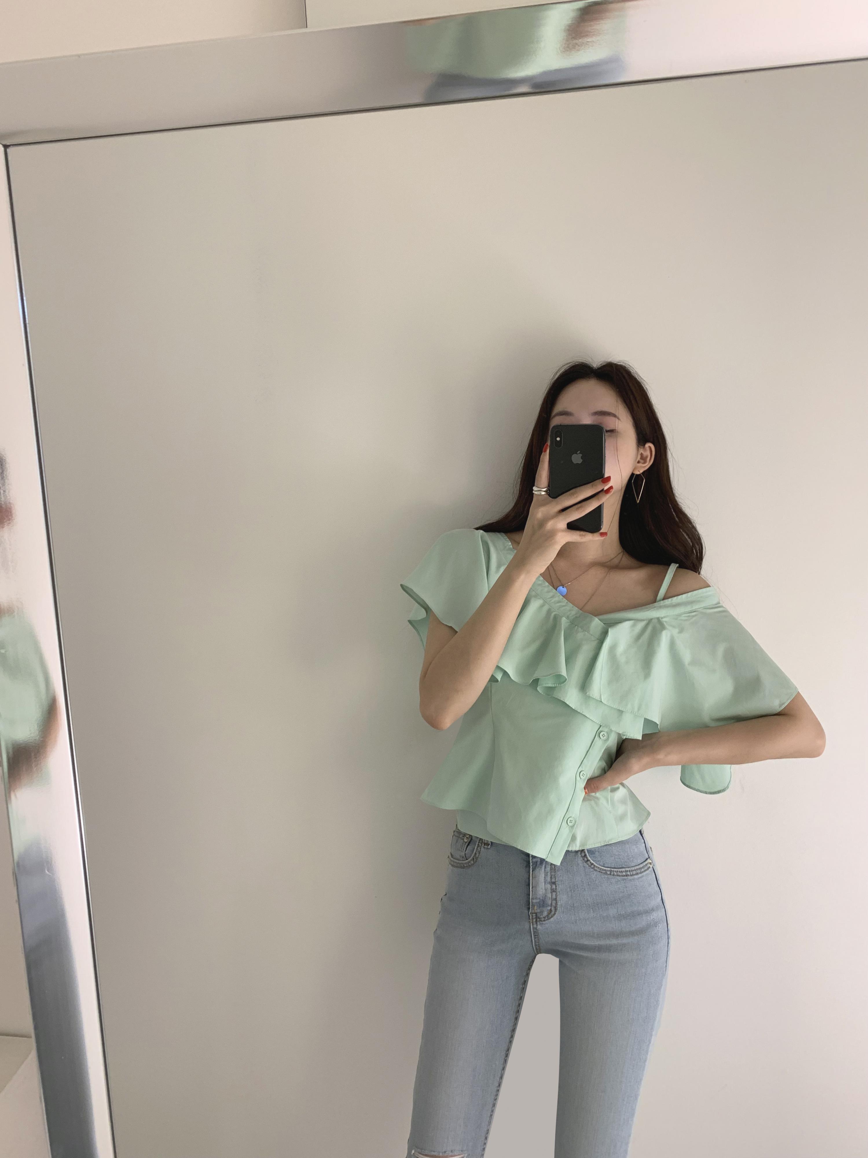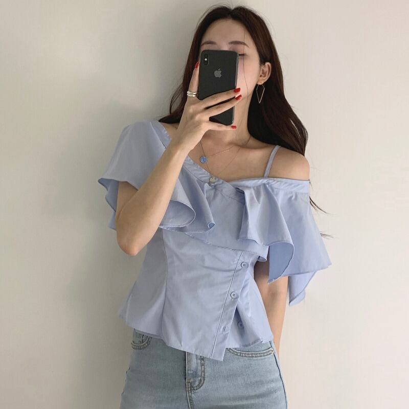 夏の新しいシックなワイルドミントグリーンは、白いオフショルダートップフリル斜めバックルデザイン半袖シャツの女性を明らかにします 韓国婦人57804427801