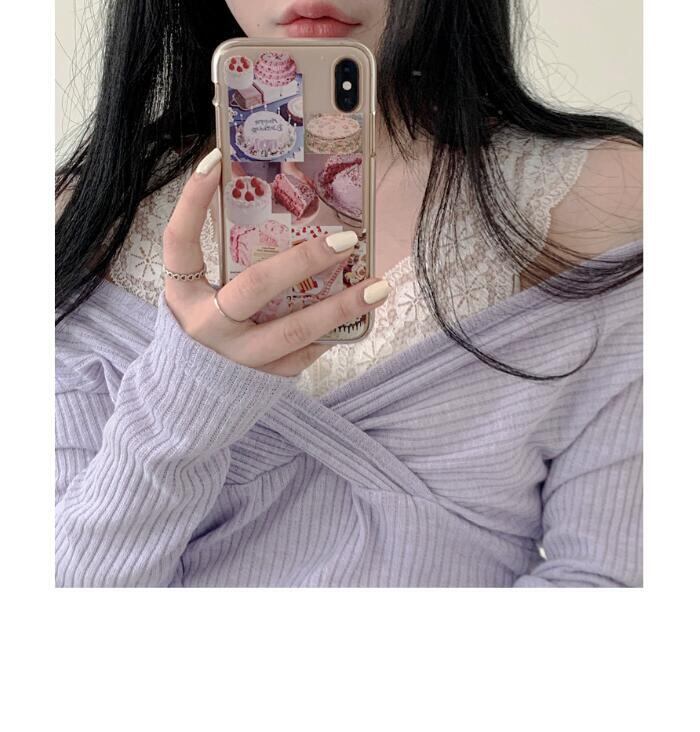 シックなエインスタイルバイオレットレースかぎ針編みステッチ漏れのある肩注意深いマシンスリム長袖セーターTシャツ女性 韓国婦人6646352558