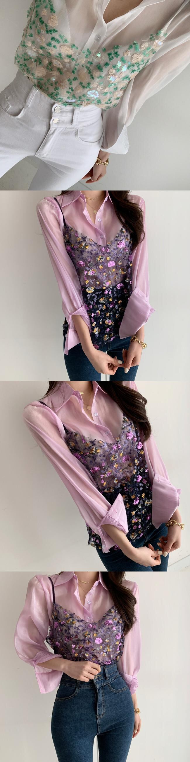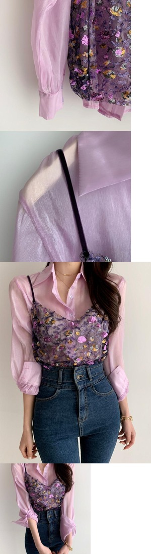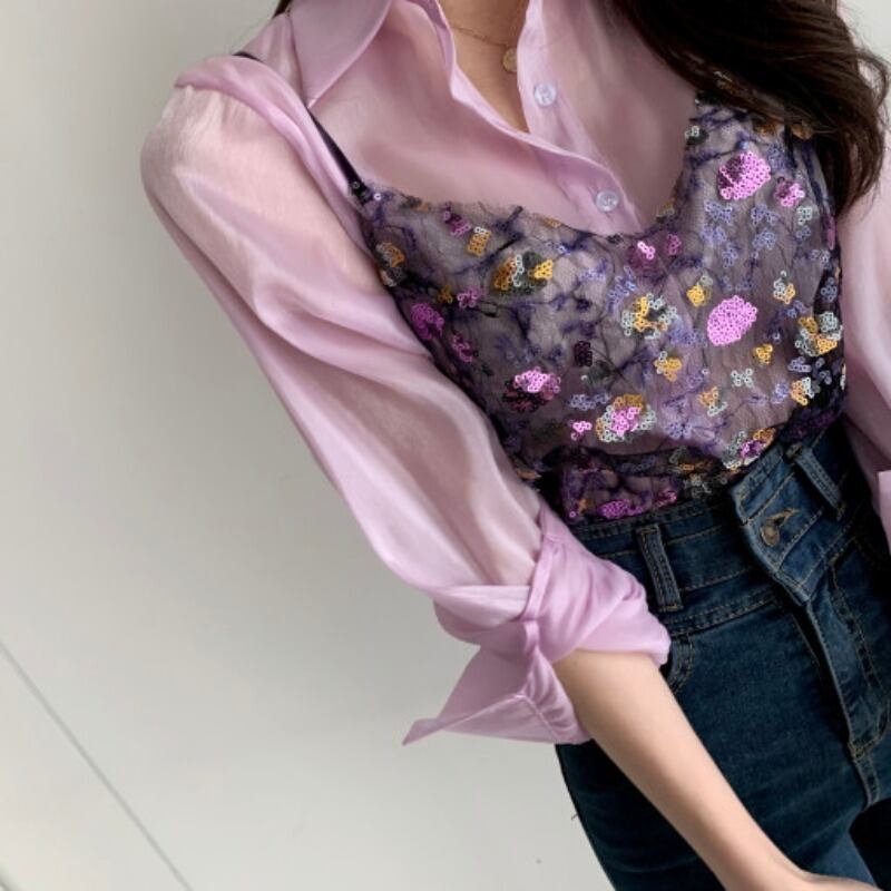 東大門フラワーレーススパンコールベストサスペンダー+薄手のラペルメッシュシャツツーピーストップトレンド 韓国婦人93746047018
