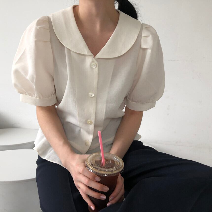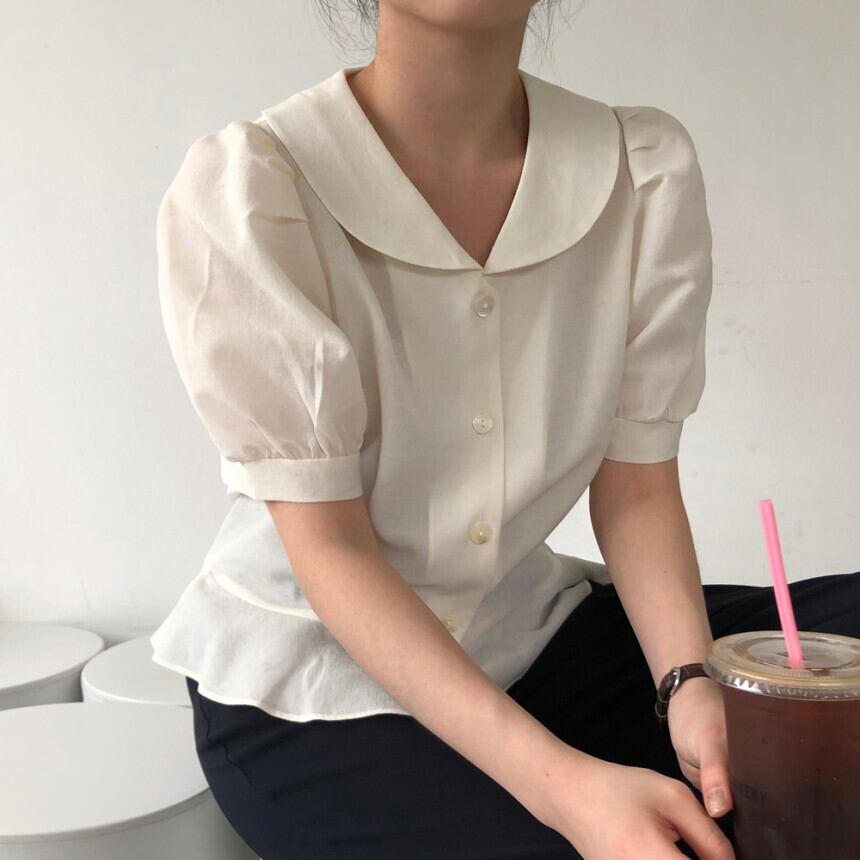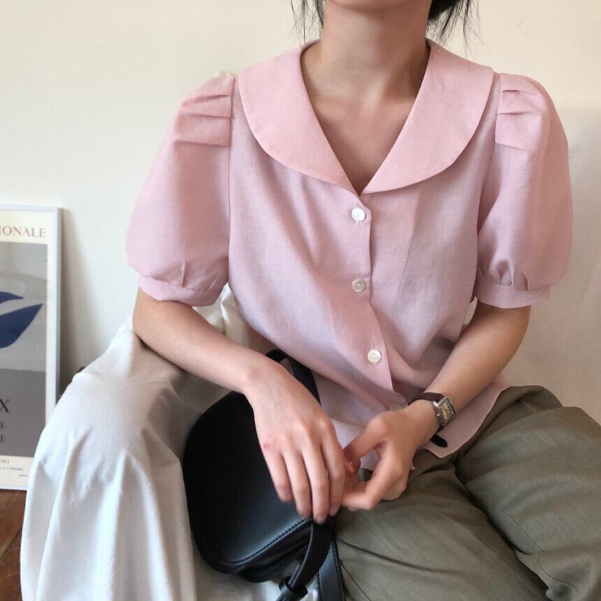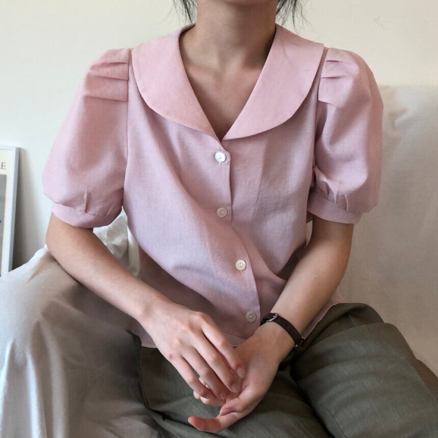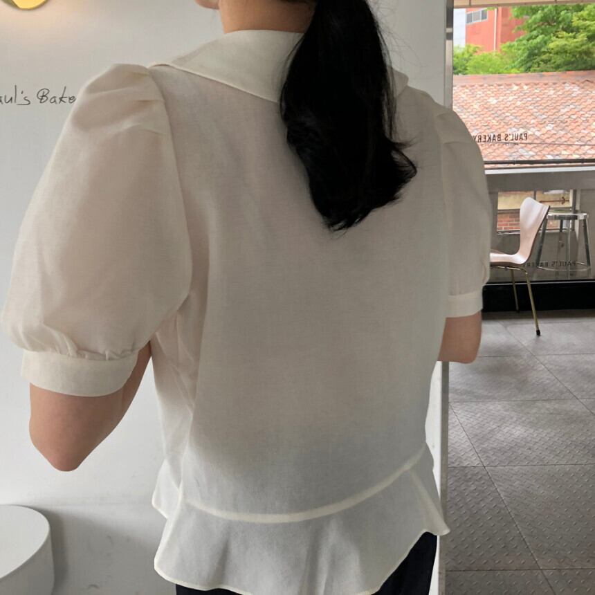 サウスシックニッチエインスタイルドールカラーシングルブレストルーズプリーツデザインパフスリーブフリルシャツレディース 韓国婦人49068519514