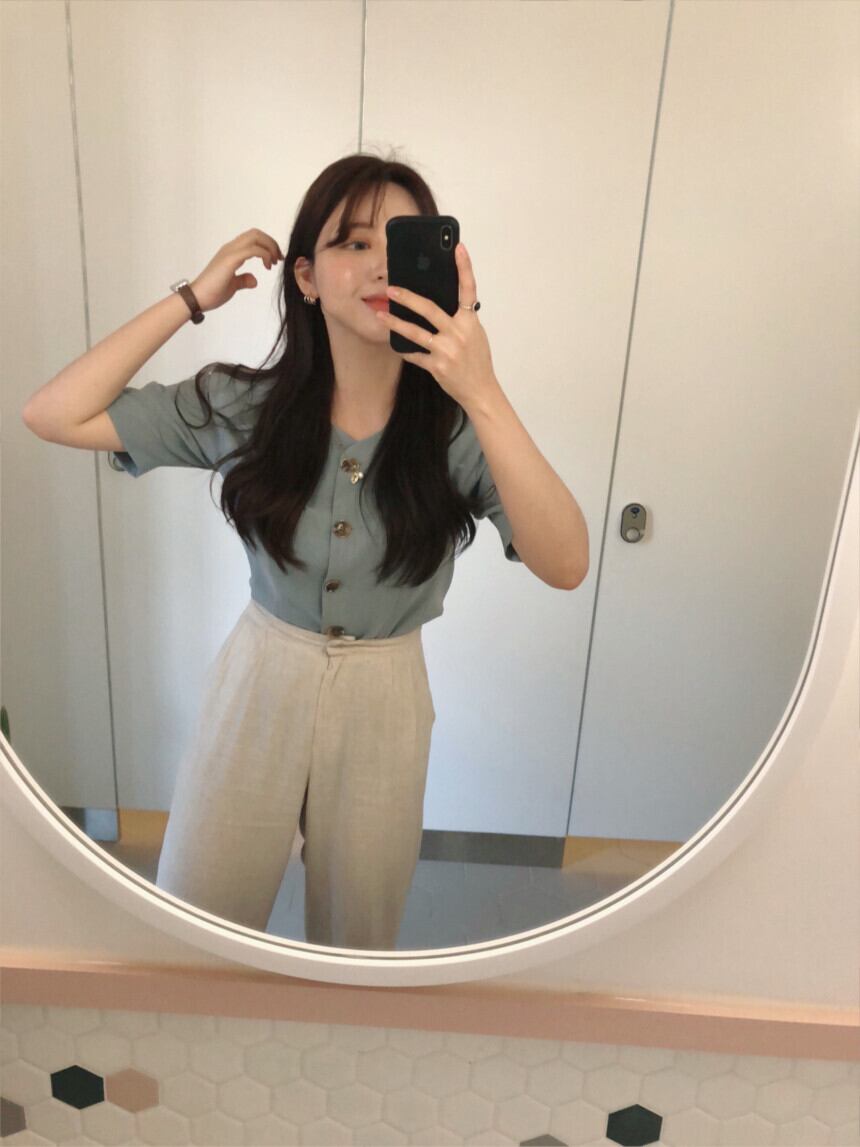 シックな夏のレトロなヘイズブルーホワイトシックな小さなポケットシングルブレストの薄いショートシャツトップの女性 韓国婦人93015086464