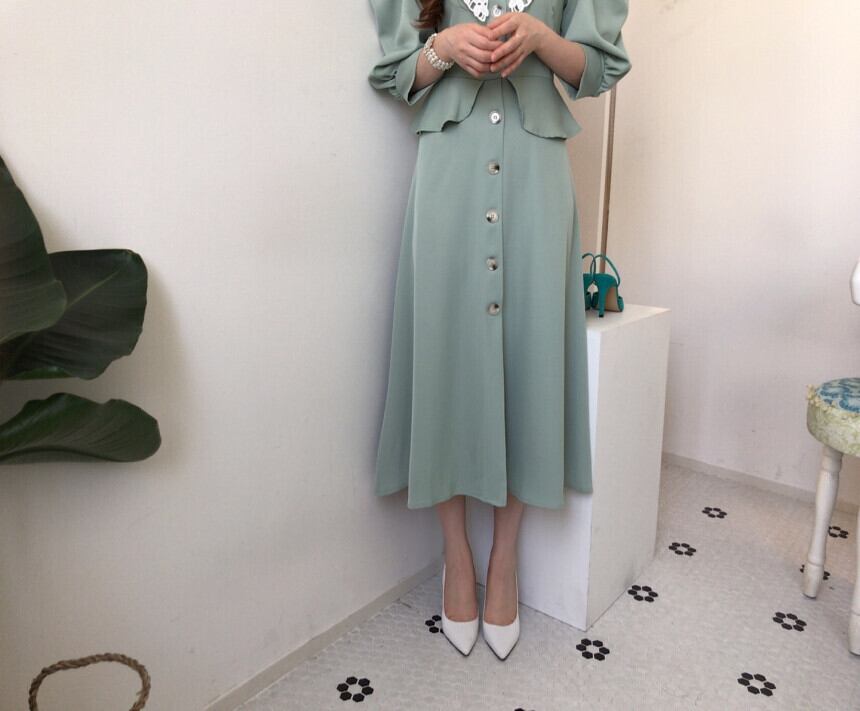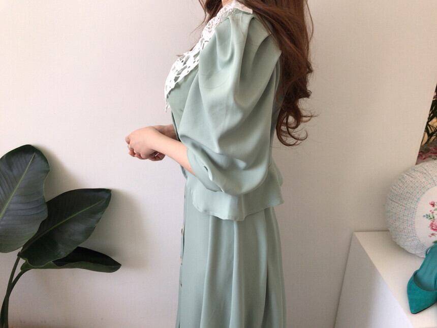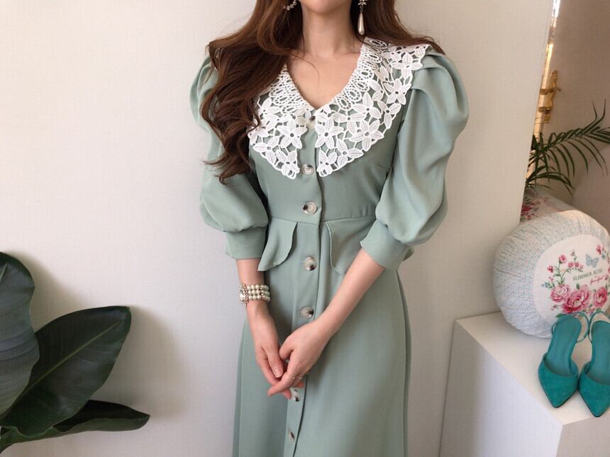 insフレンチライトクックドラペルレースかぎ針編みシングルブレストウエスト5点パフスリーブドレス女性 韓国婦人43115234771