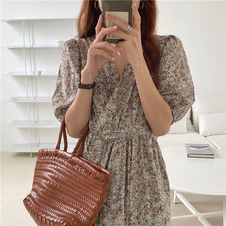 南イン夏フレンチレトロVネックスモールフローラルワンピースミドル丈レースアップウエスト半袖ワンピースレディース 韓国婦人7547295952