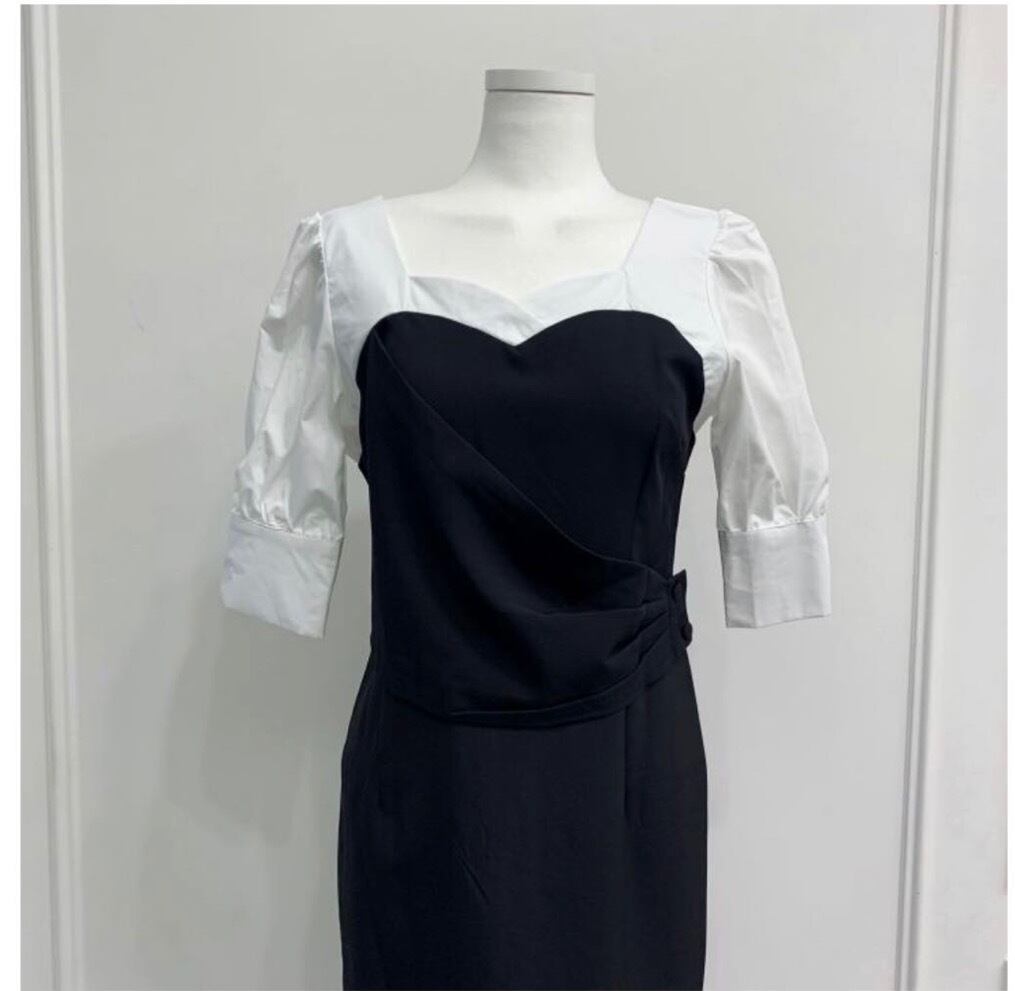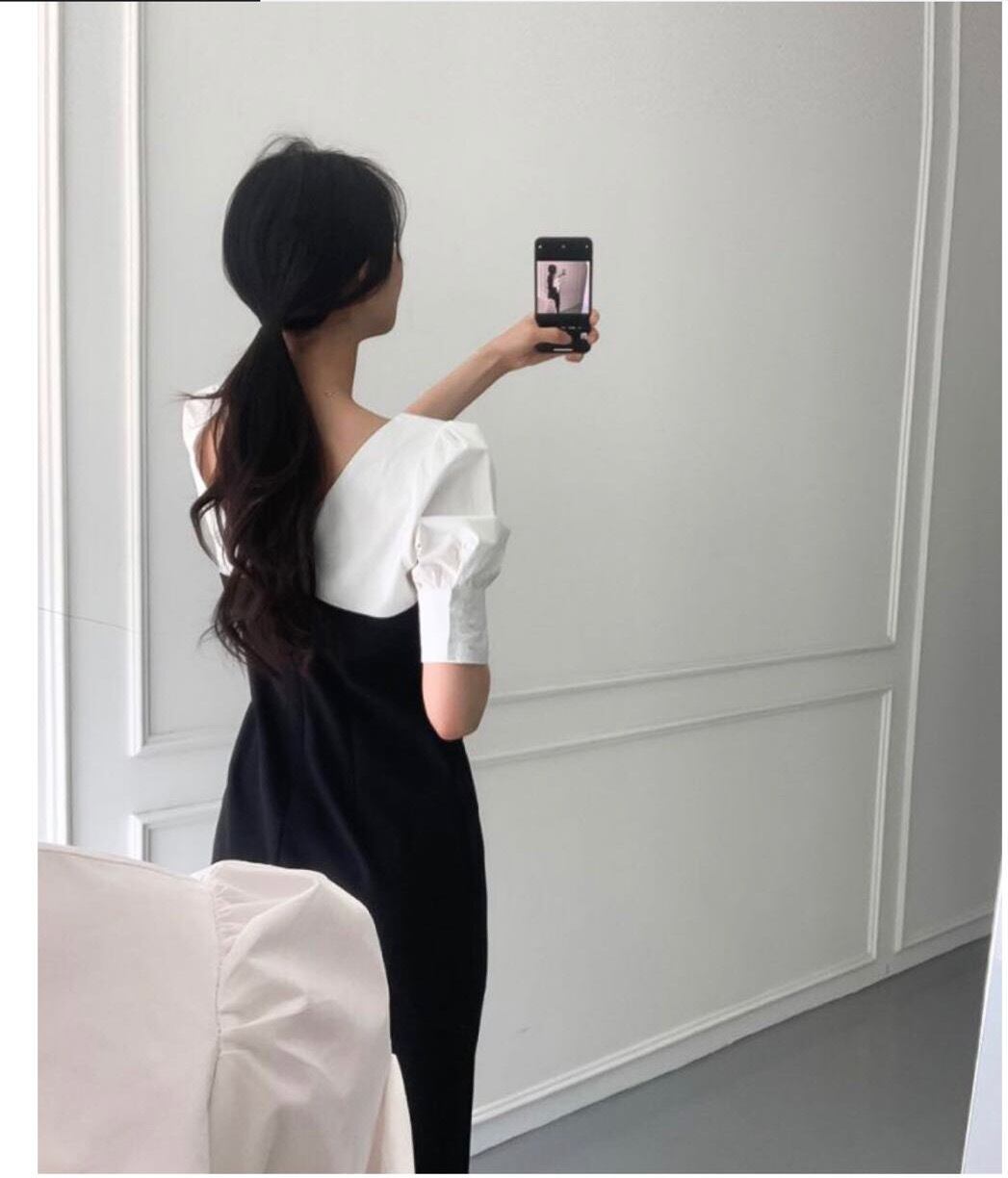 insウエスタンフレンチスクエアカラーステッチ黒と白のコントラストカラーミドル丈パフスリーブウエストバッグヒップドレス女性 韓国婦人42944574790
