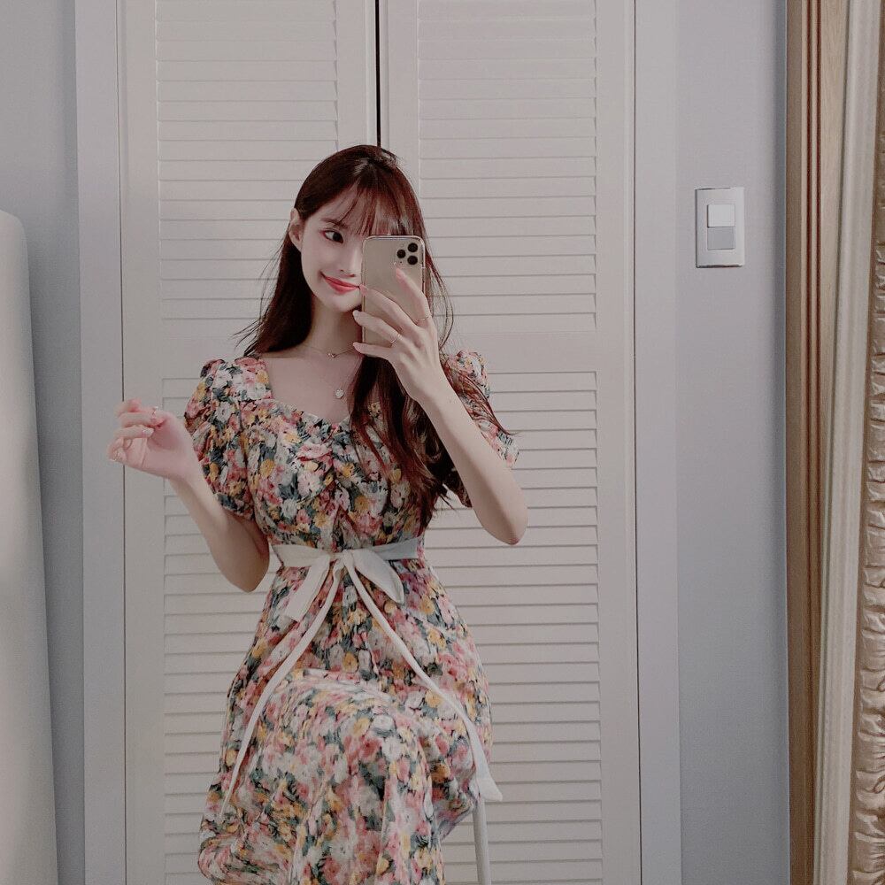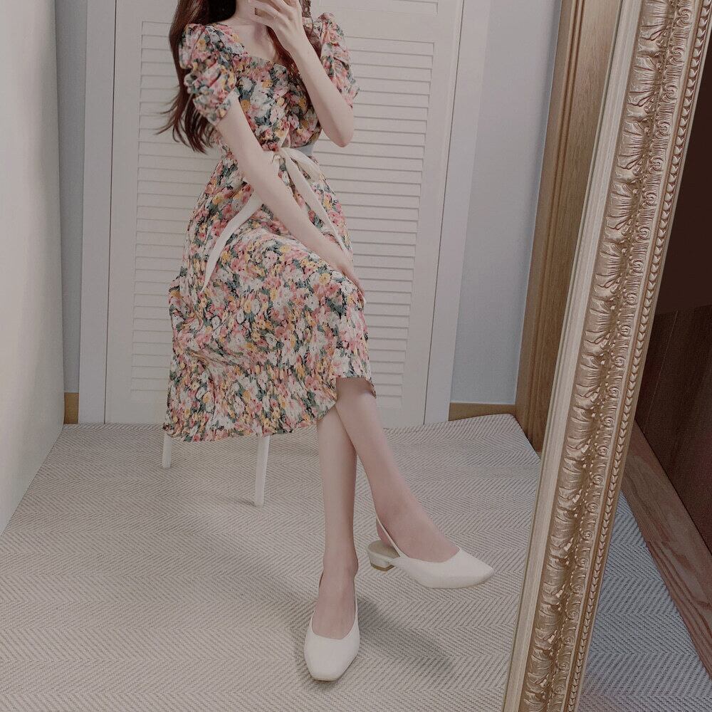 フランスのレトロなパフスリーブドレスフローラルVネックミドル丈気質ウエストウエストは細くて軽い成熟した2020年夏の新作 韓国婦人18312586614