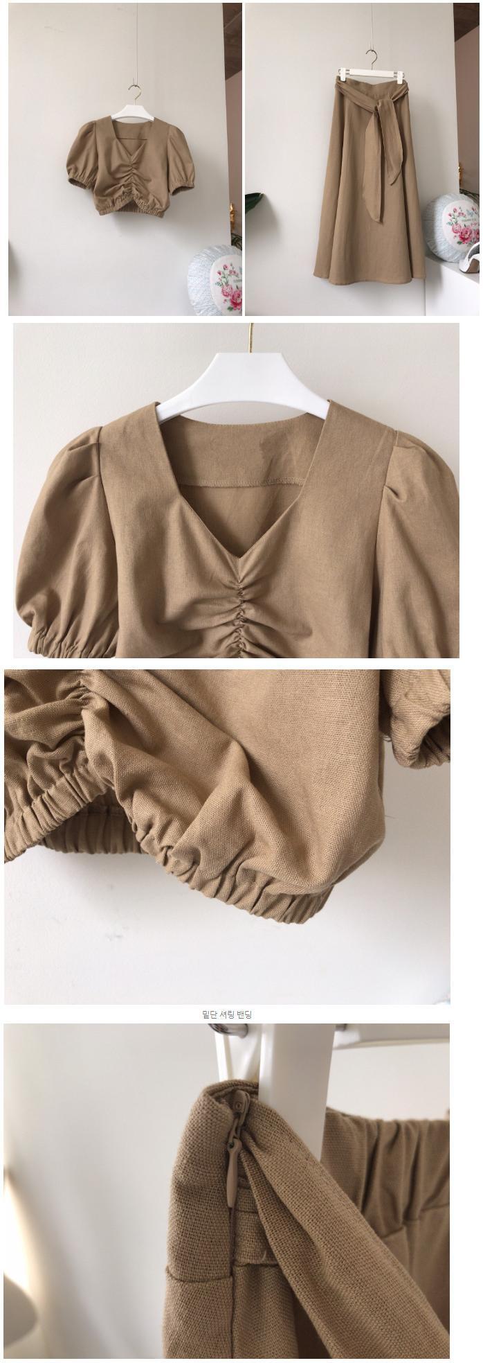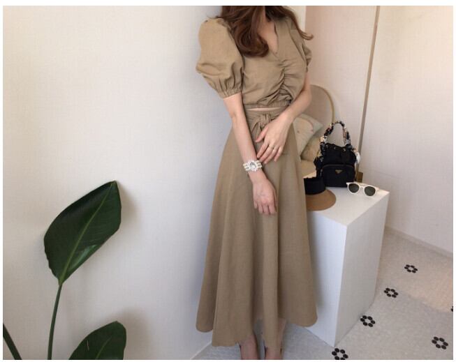 シックなニッチな気質Vネックプリーツパフスリーブシャツ+ハイウエストネクタイボウスカートロングスカートメス 韓国婦人40610354966