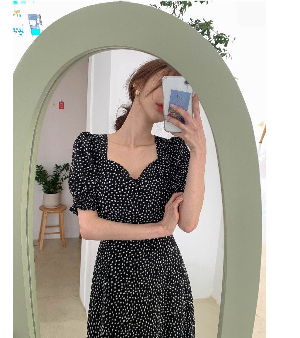 insフレンチレトロ薄いスクエアカラーハイウエストレースランタンスリーブロングデイジードレスリトルブラックドレス女性 韓国婦人24682551910