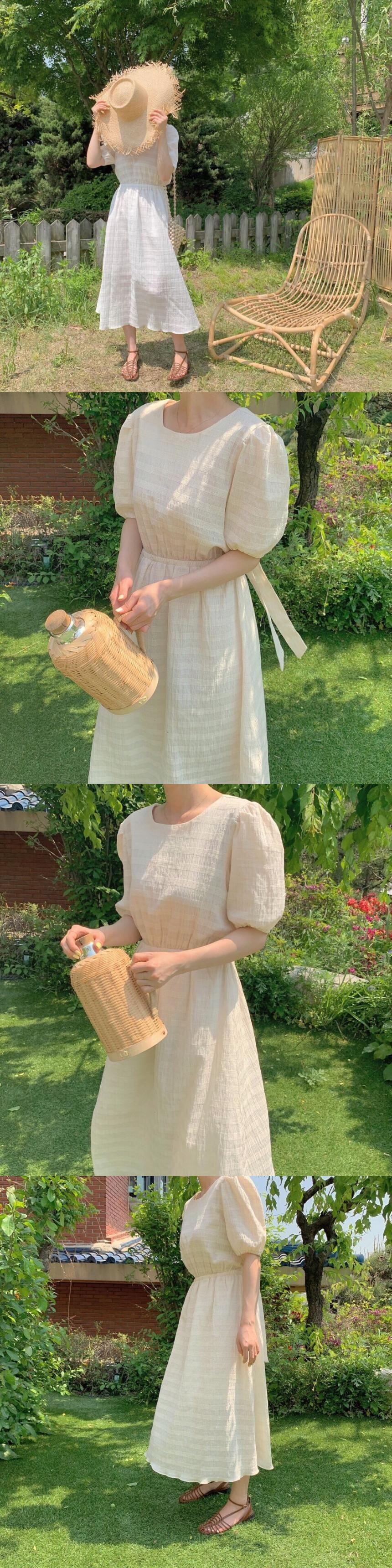 シックで優しいラウンドネックバック中空ネクタイ蝶ネクタイは細いハイウエストパフスリーブプラチコドンドレス女性でした 韓国婦人26532272657