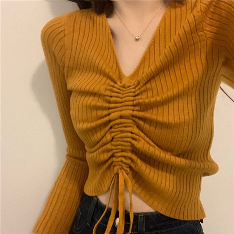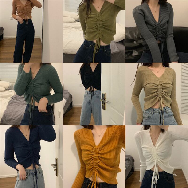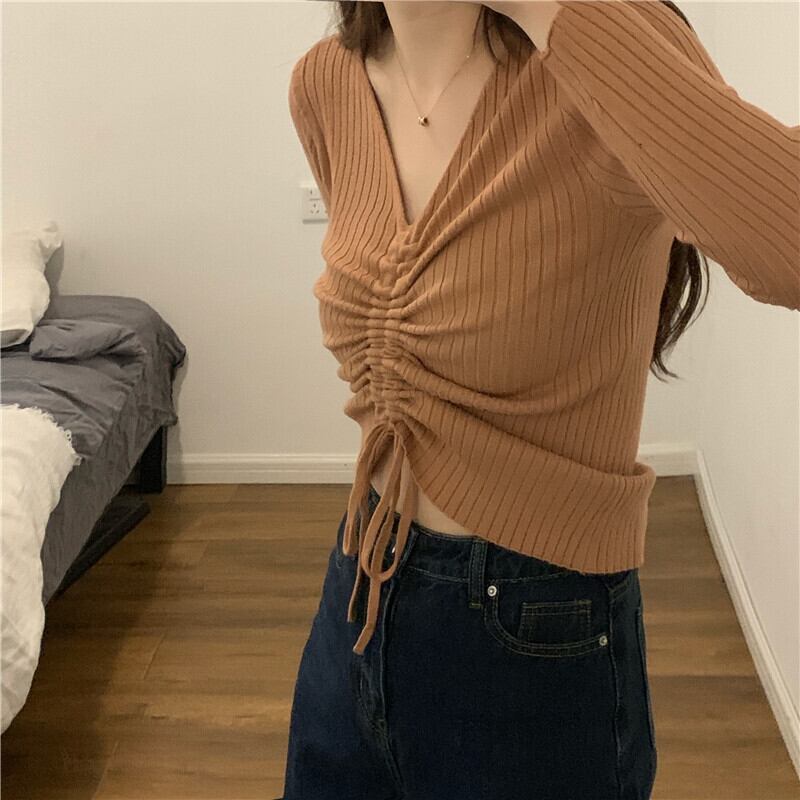 ins活力春ワイルドシンプル巾着セーターVネックピットストリップ長袖ボトミングシャツトップ 韓国婦人57405445116